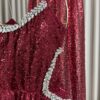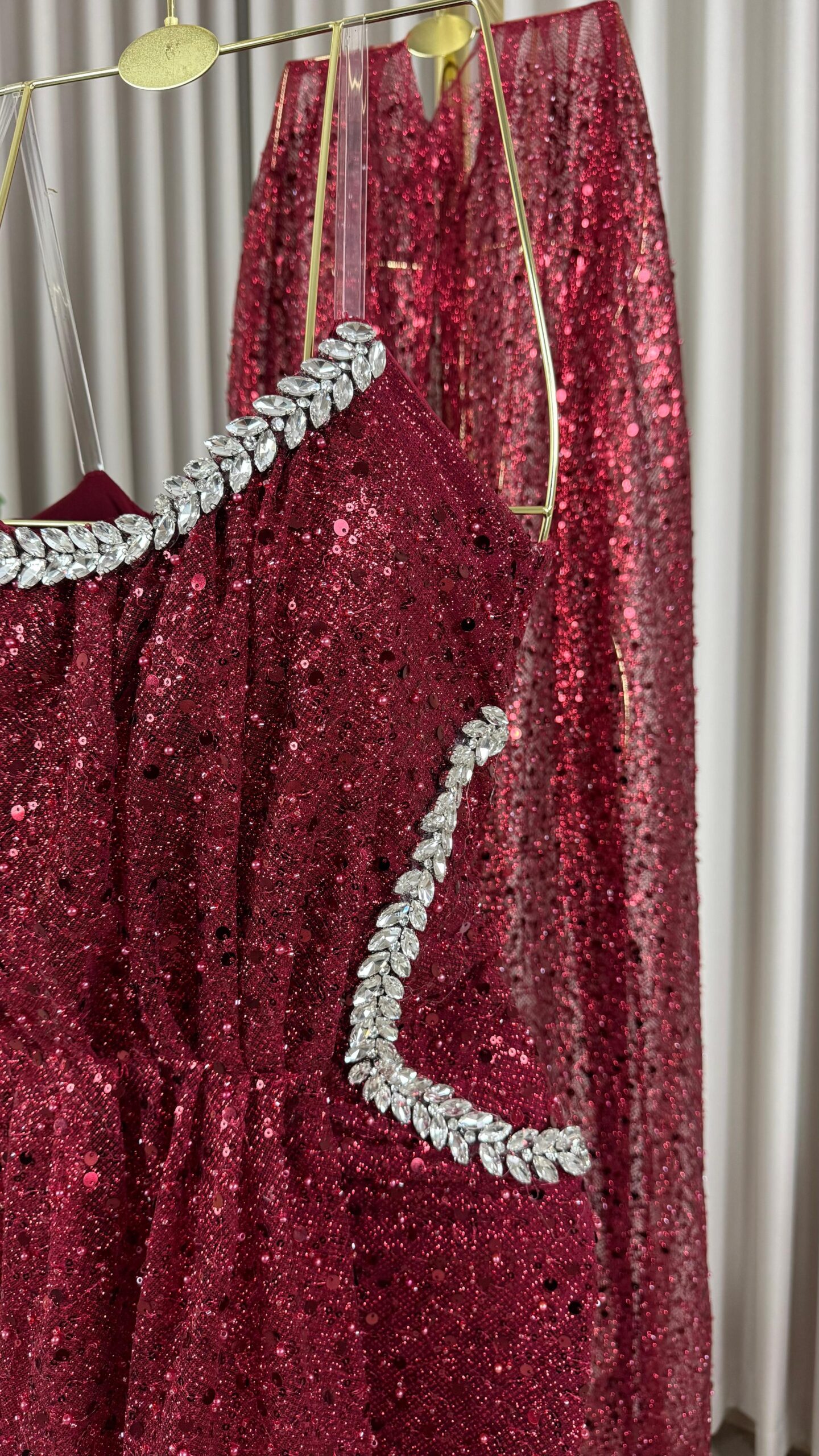 فستان سهرة عنّابي براق، بتفاصيل متقنة وتصميم ملكي يعبّر عن جمال المرأة السعودية وأناقتها اللافتة.
