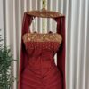 تصميم فاخر يجمع بين القصّة الضيّقة التي تبرز جمال القوام، والتطريزات اللامعة من الخرز والكريستال الذهبي التي تزيّن الصدر والأكتاف لتمنحك بريقًا ساحرًا تحت الأضواء.