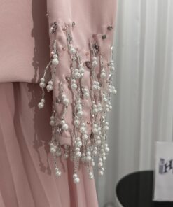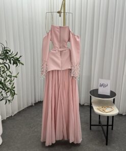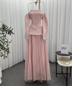 الفستان الوردي هو عنوان الأنوثة والجاذبية، وهذا التصميم العصري يمنحك إطلالة متكاملة للمناسبات الخاصة. يتميز بقصة أوف شولدر ناعمة مع أكمام طويلة مطرزة باللؤلؤ والخرز المتدلي لمزيد من الفخامة. التنورة الشيفون الواسعة تضيف لمسة من الرقي والنعومة، مما يجعله خيارًا مثاليًا للسهرات الفاخرة، وحتى المناسبات