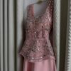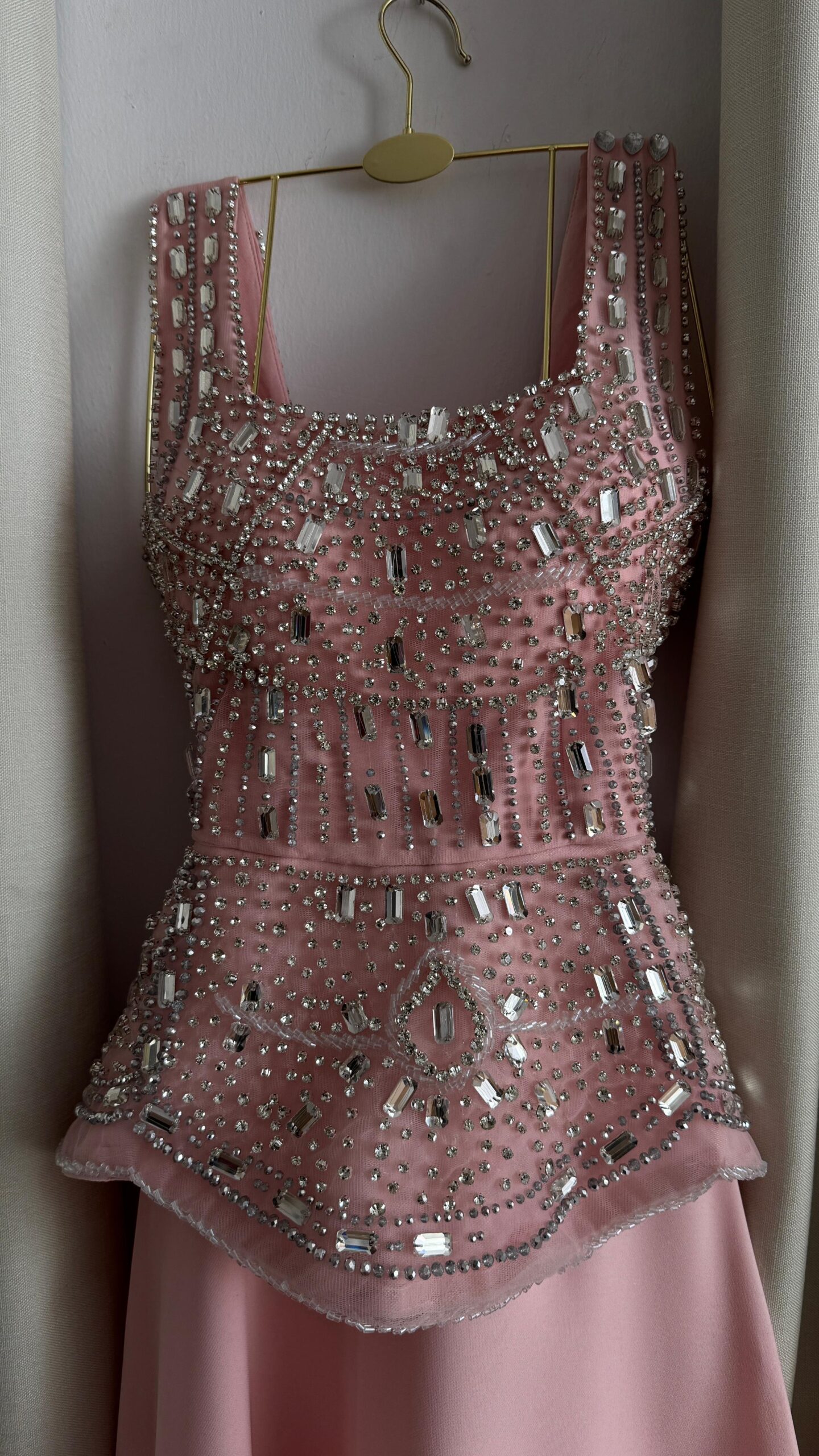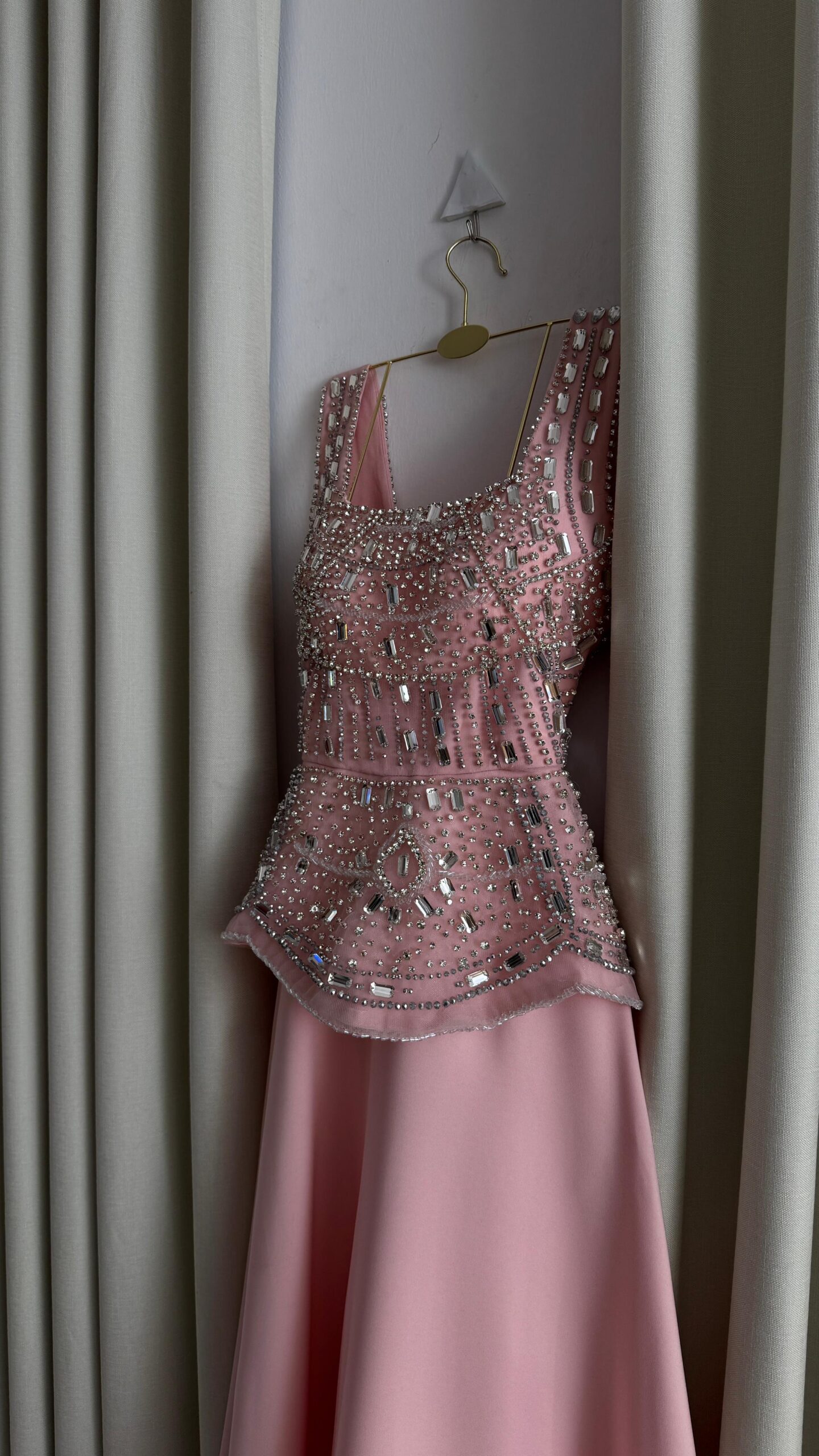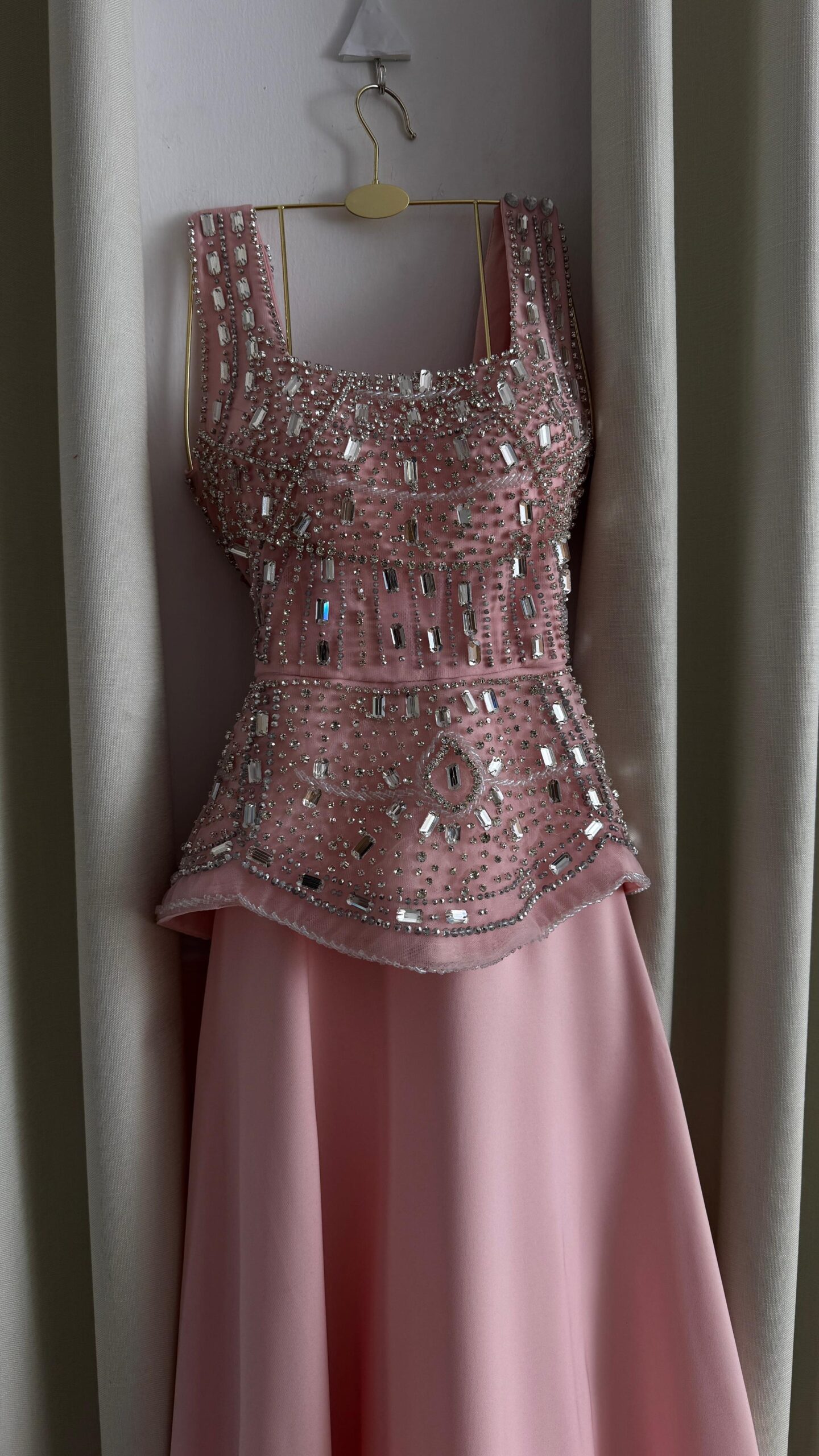 فستان سهرة وردي بتصميم راقٍ ولمسة فخامة أنثوية