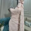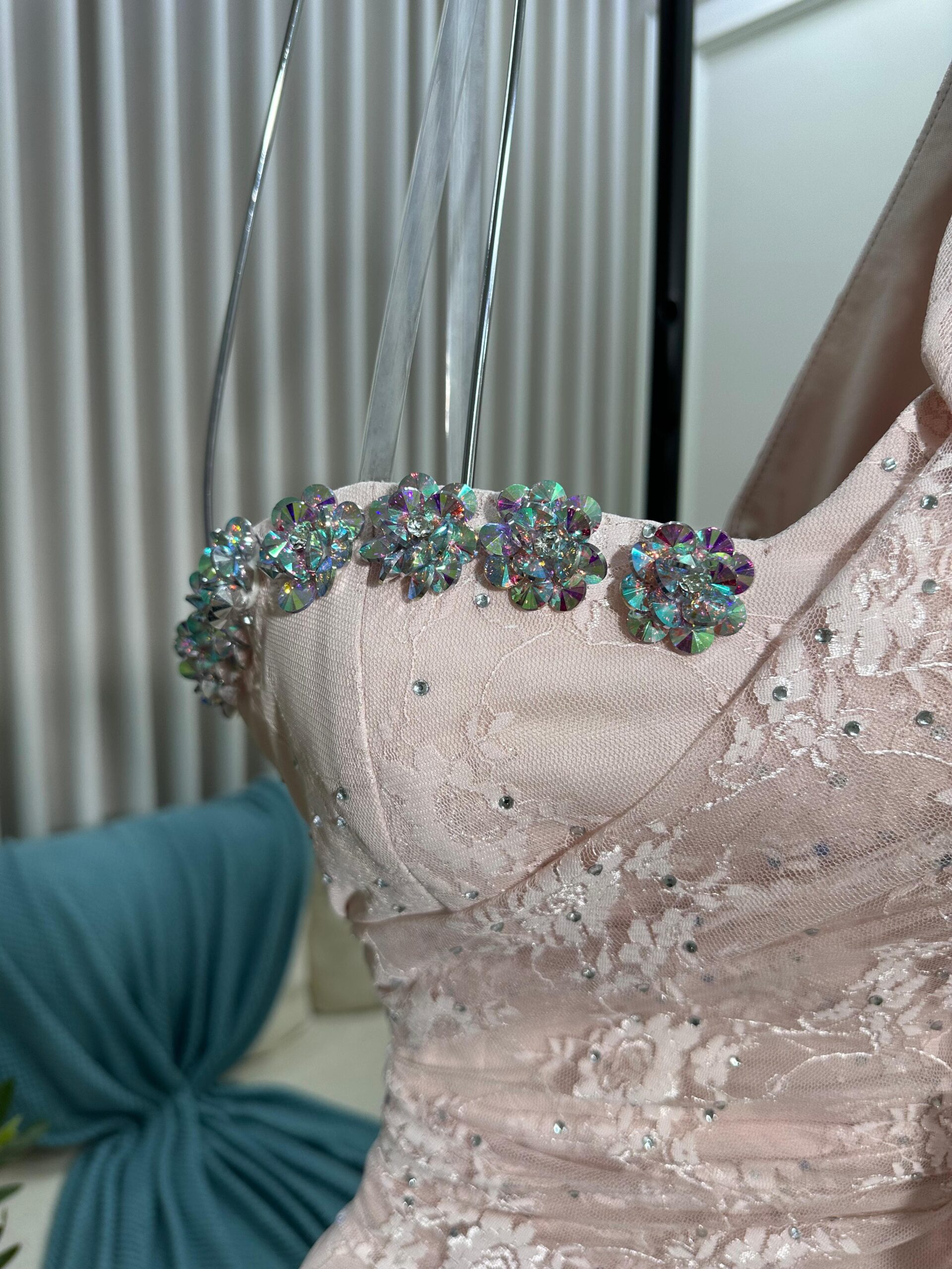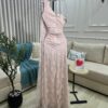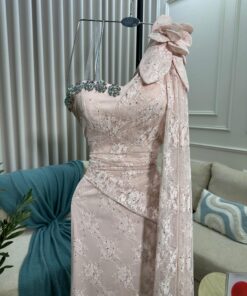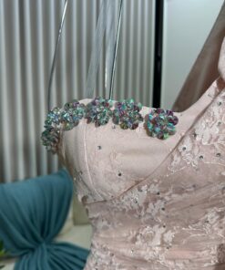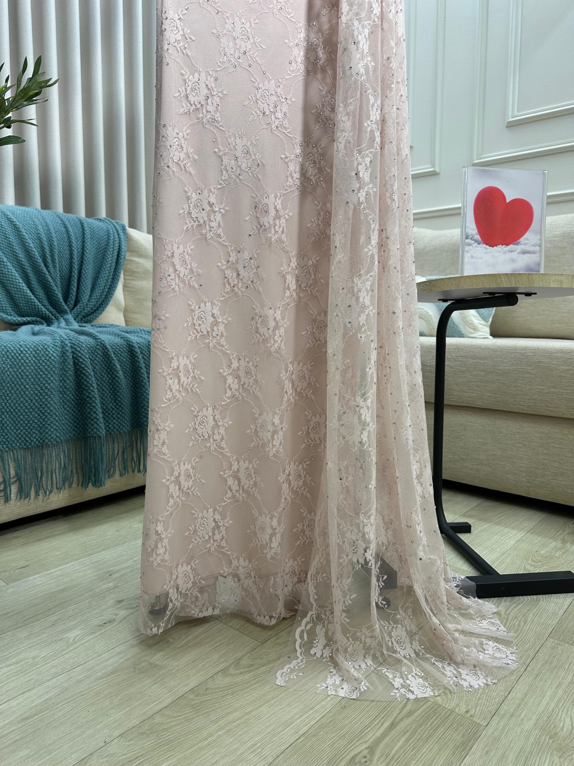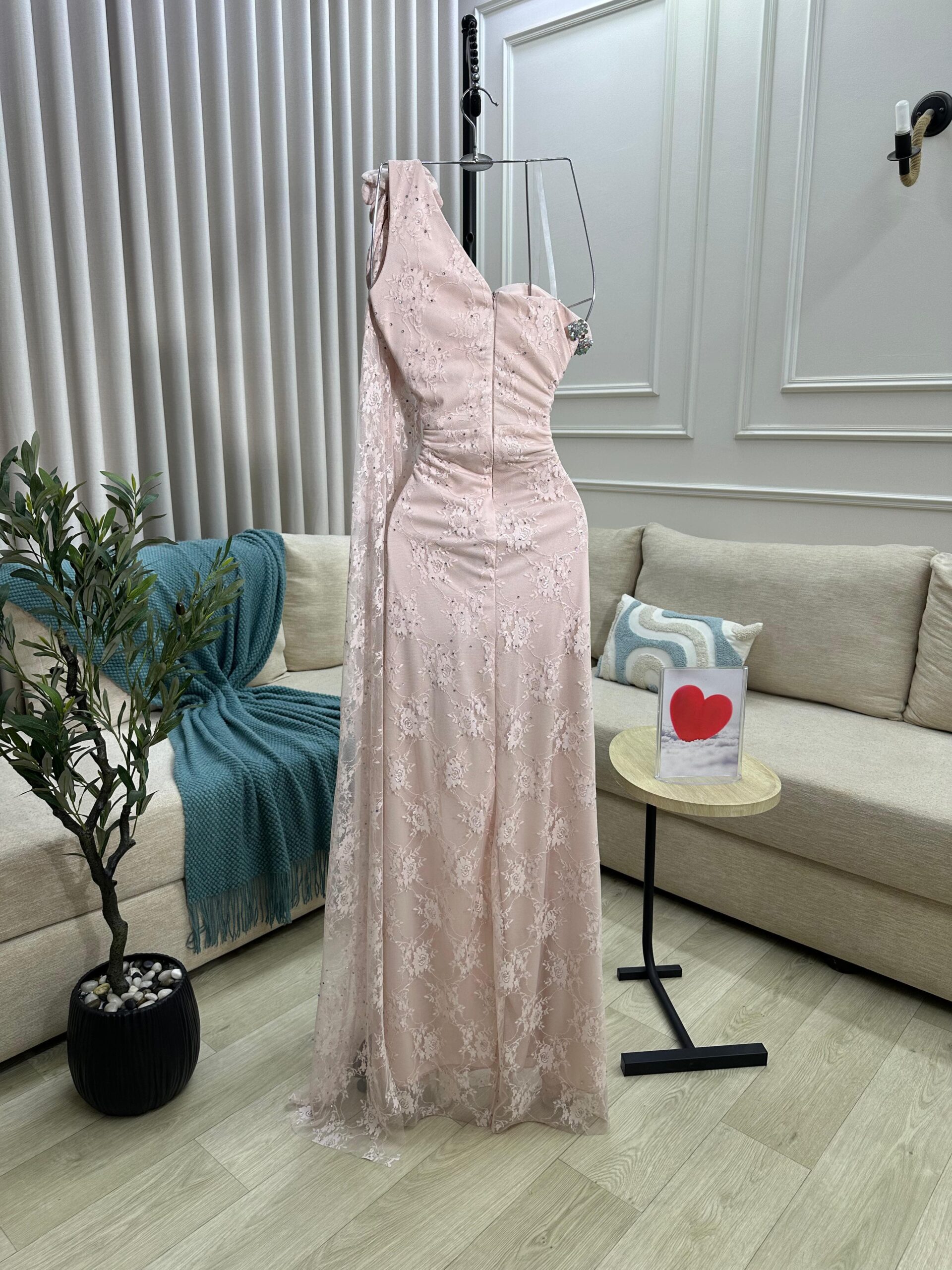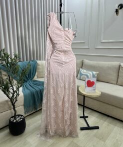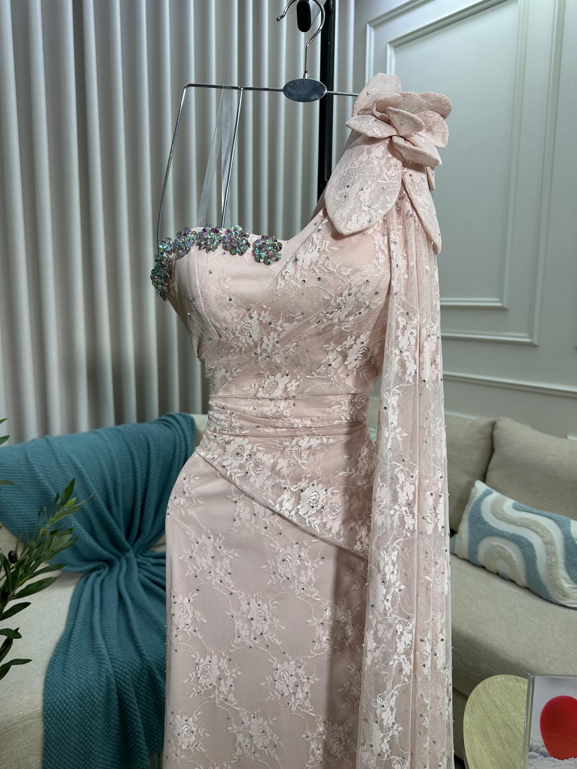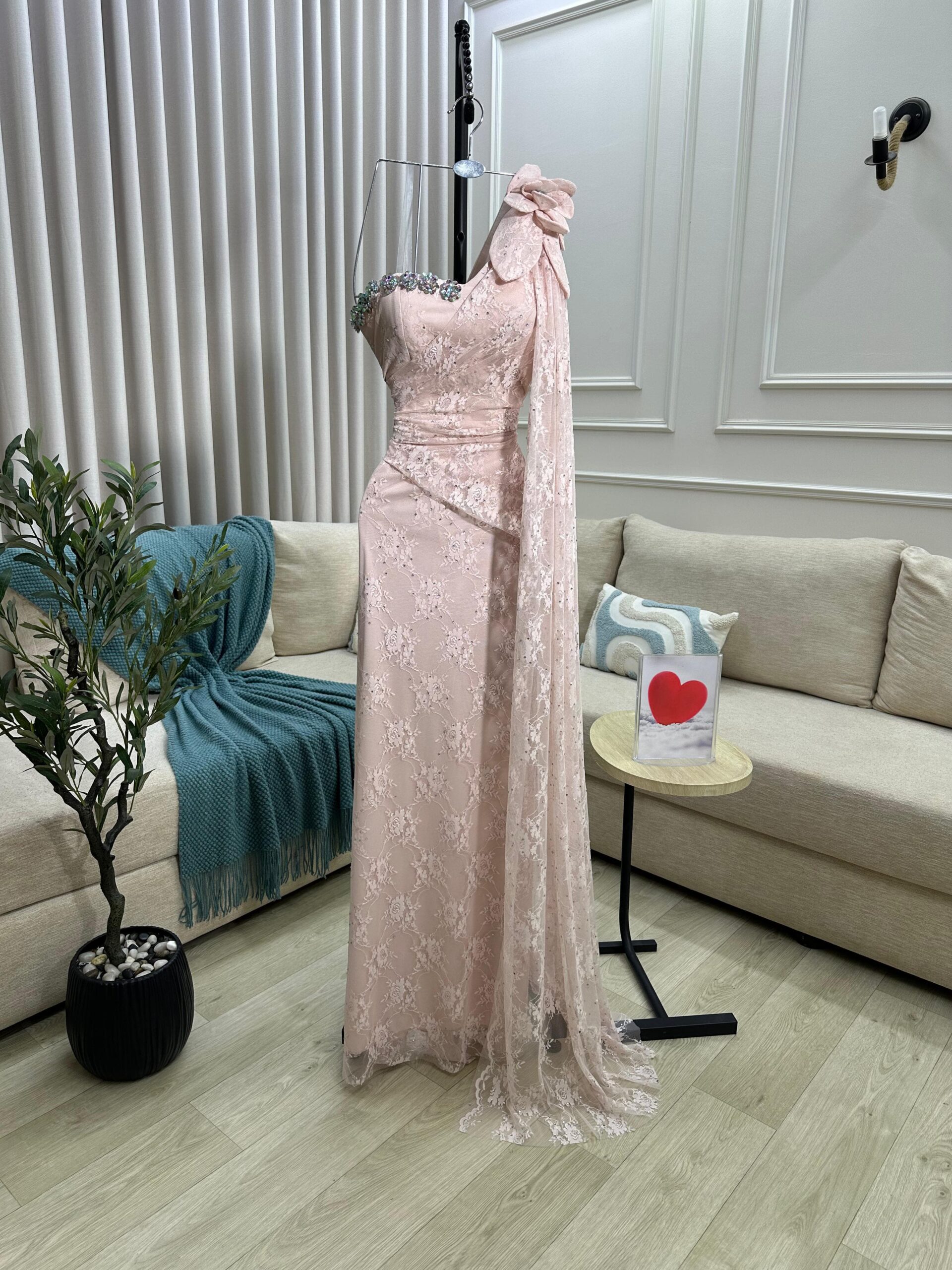 يأتي الفستان بتصميم فخم مع تفاصيل دقيقة من الدانتيل الوردي الناعم الذي يغطي كامل الفستان، بينما يزين الكتف الأيسر مزهرًا أنيقًا يضيف لمسة من الجمال والأنوثة. بالإضافة إلى ذلك، يتميز الجزء العلوي من الفستان بتطريزات براقة تبرز بشكل رائع تحت الضوء، مما يجعله مناسبًا لحفلات الزفاف، السهرات الليلية، والمناسبات المميزة.