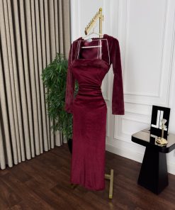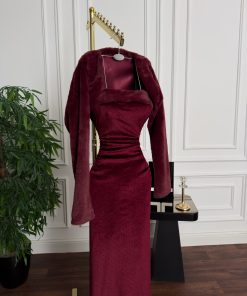 فستان سهرة مخمل بورغندي مع جاكيت فرو فاخر