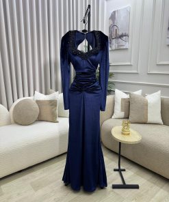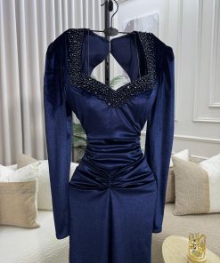 فستان سهرة مخمل كحلي طويل بأكمام طويلة وتطريز أنيق