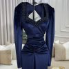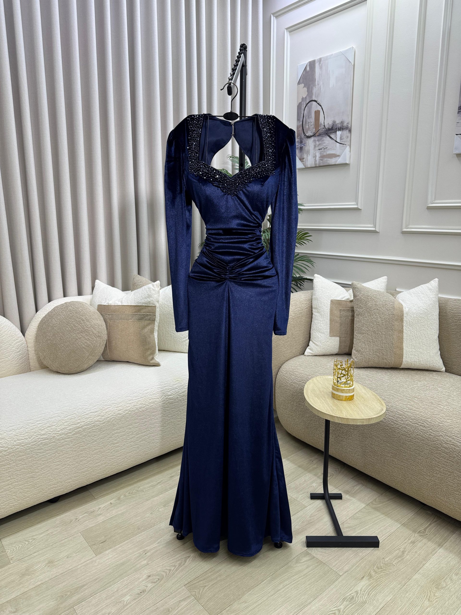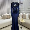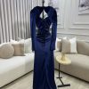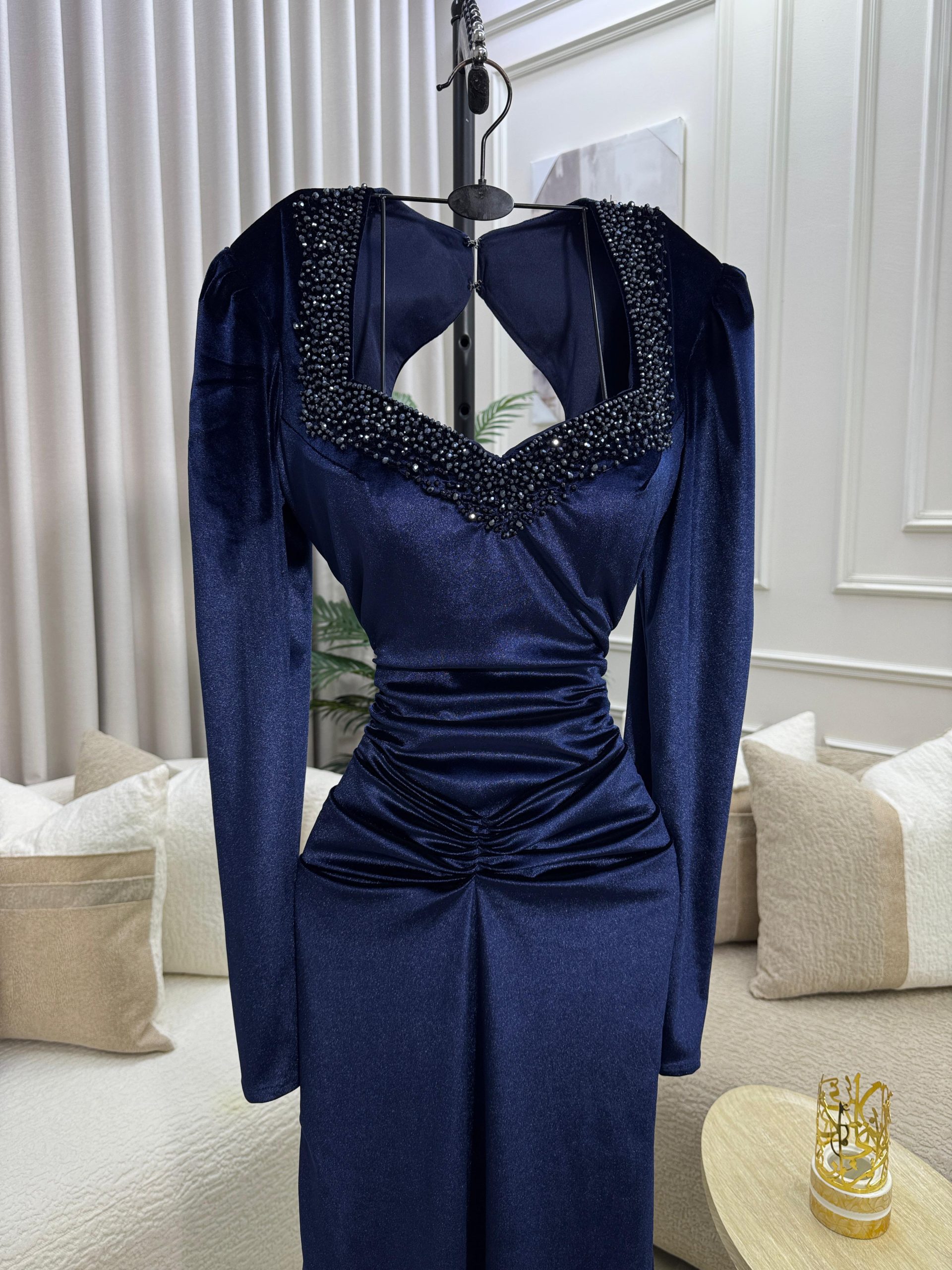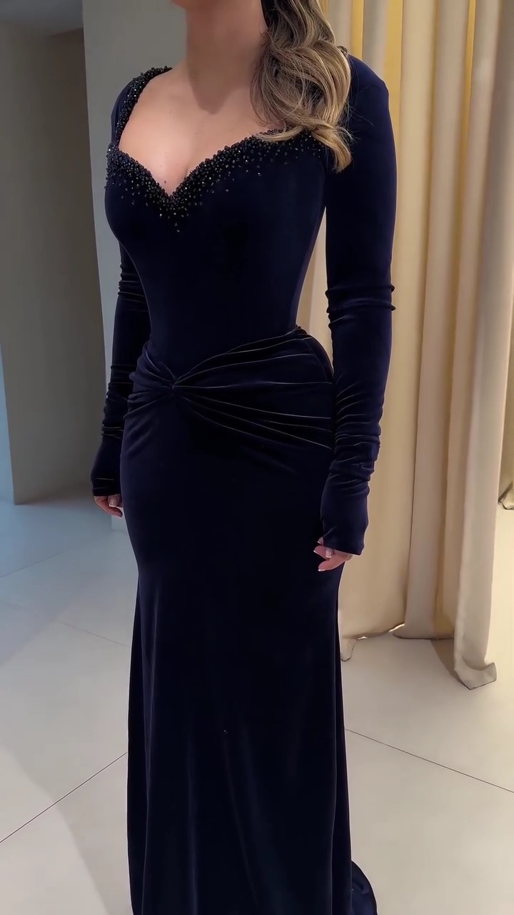 فستان سهرة مخمل كحلي طويل بأكمام طويلة وتطريز أنيق