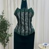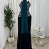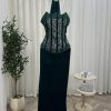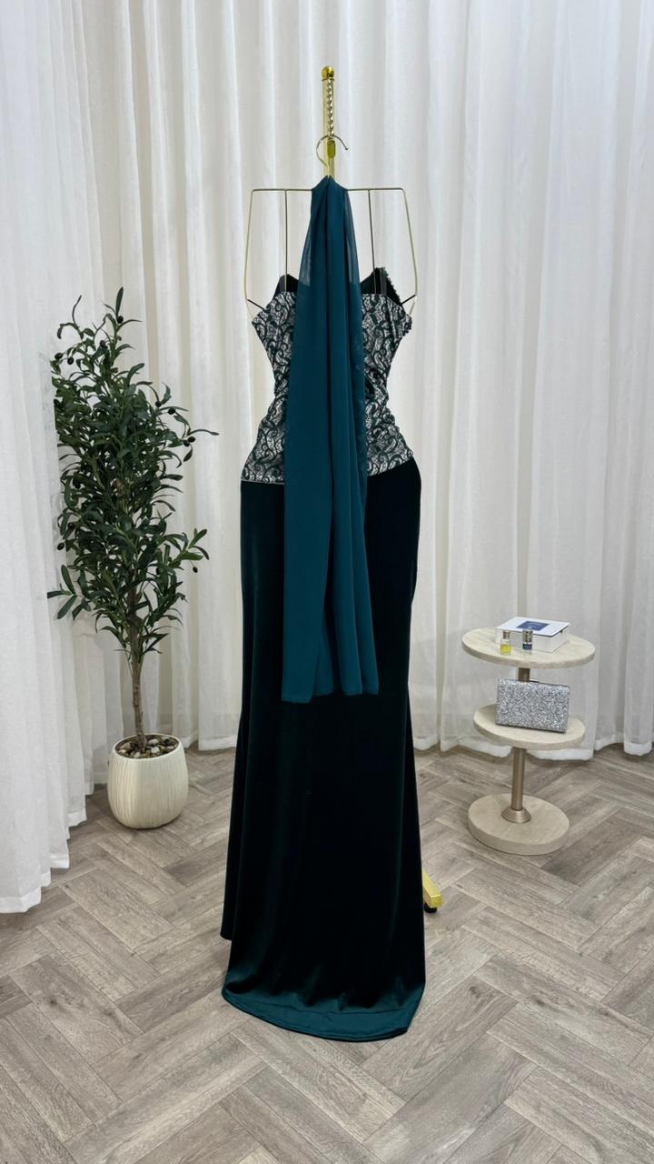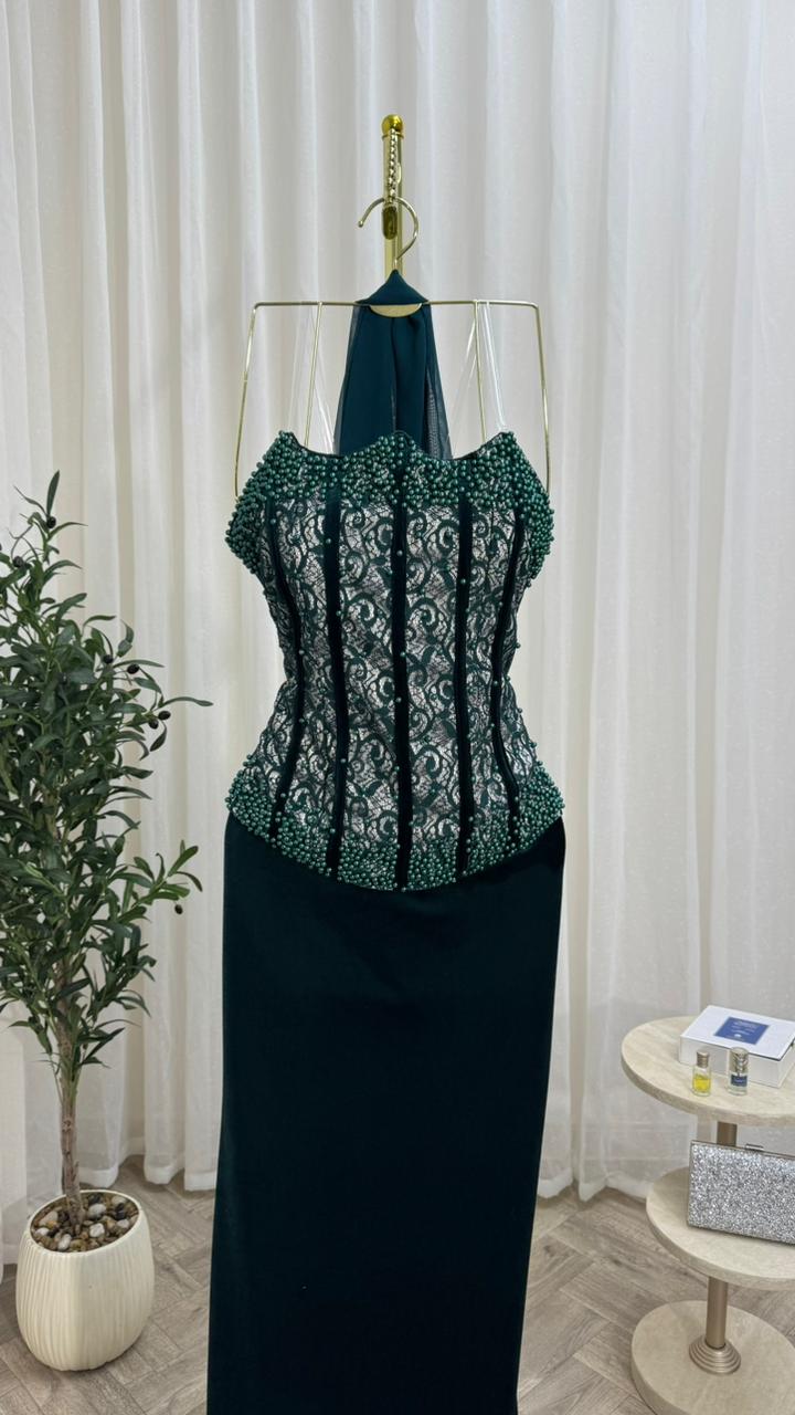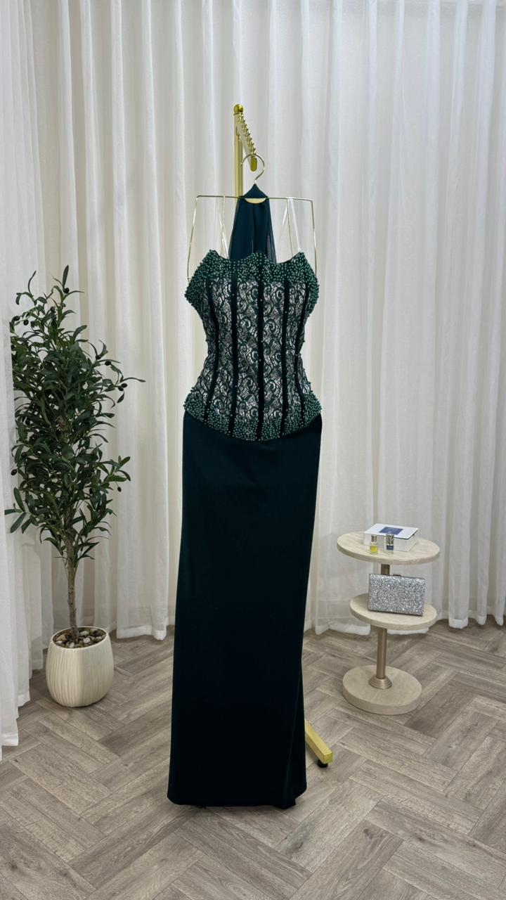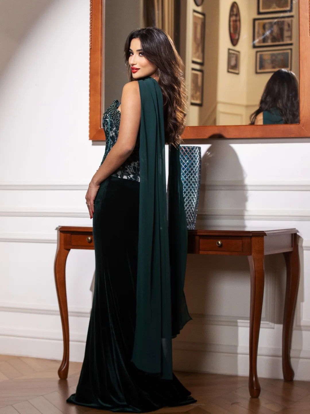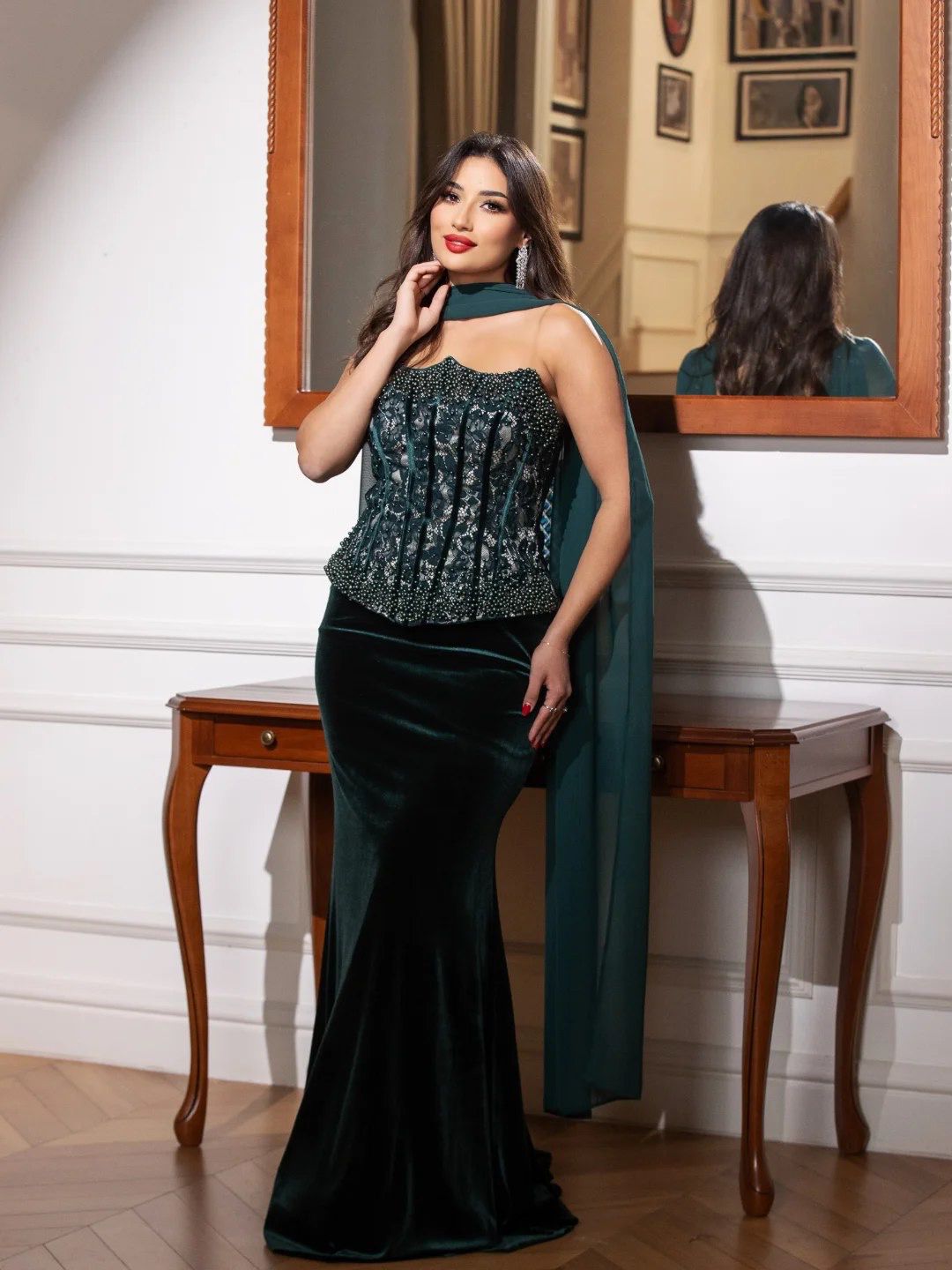 يتميز الفستان بتطريزات خرز لامعة في الجزء العلوي، مما يمنحه إشراقة وفخامة فورية. الخرز الذي يغطي الجزء العلوي بشكل متناغم يبرز جمال الفستان ويضفي لمسة من البذخ، ليجعله يناسب تمامًا المناسبات التي تتطلب إطلالة مميزة. التصميم المميز للجزء العلوي يبرز القوام بشكل رائع، في حين أن التنورة الضيقة المنسدلة من المخمل تمنح الفستان طابعًا من الأناقة والرفاهية.