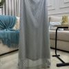الفستان يتميز بلون فضي لامع يضفي لمسة من السحر والفخامة. الجزء العلوي مزخرف بتفاصيل خرزية رائعة على شكل شبكة تمنحكِ إطلالة فاخرة. القماش المنسدل بأناقة يبرز تفاصيل الجسم ويمنحكِ مظهرًا رائعًا ينضح بالأنوثة. تصميم الياقة المفتوحة يضيف لمسة من الرقي والجمال.
