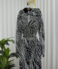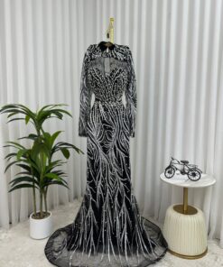 فستان سهرة طويل أنيق، مزين بتطريزات لامعة من الخرز والستراس باللون الفضي على شكل خطوط متشابكة تنساب من الأعلى إلى الأسفل، مما يمنحه مظهرًا فاخرًا وجذابًا.