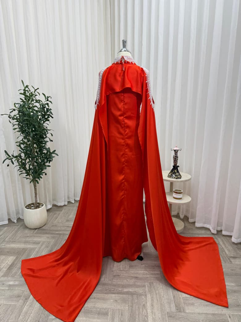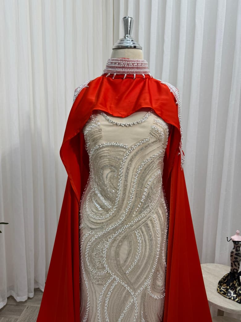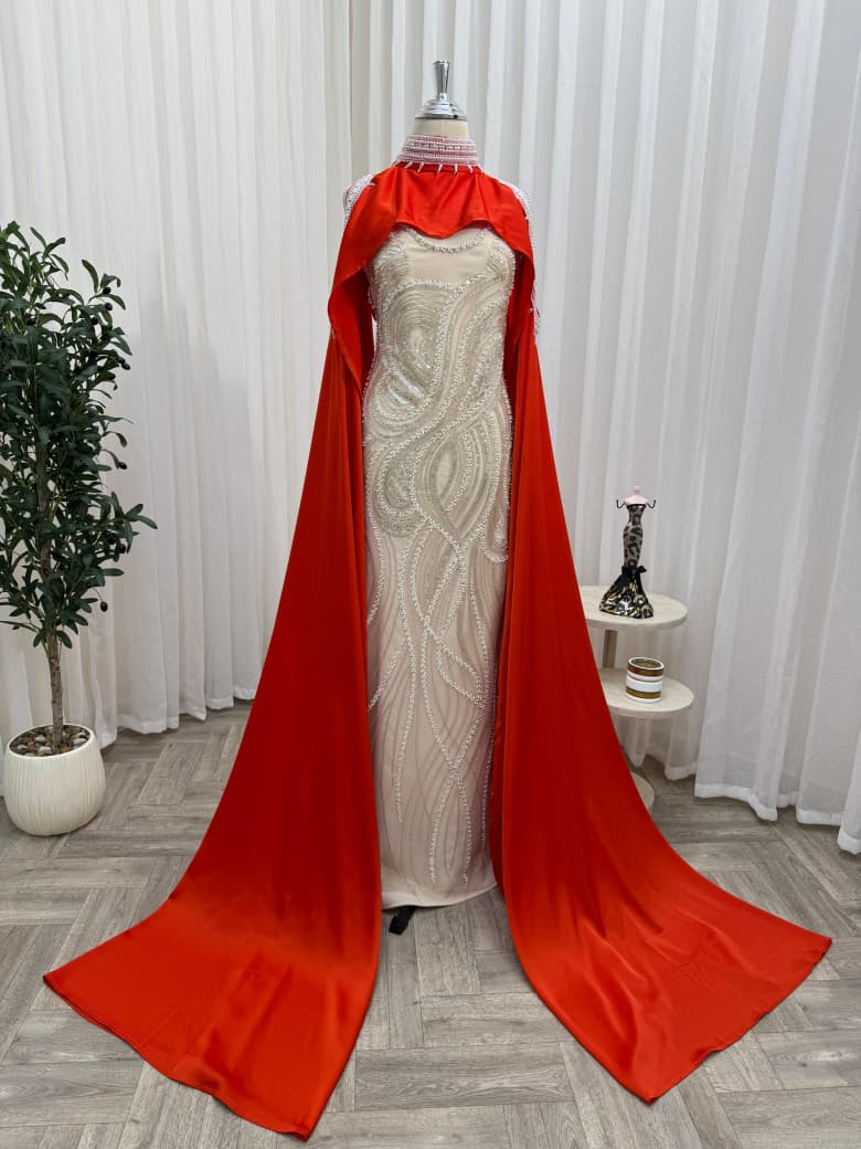 فستان سهرة مطرز مع كاب أحمر فاخر