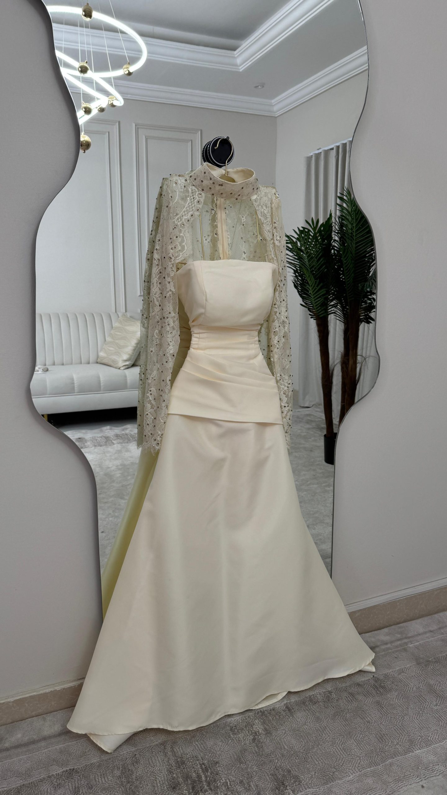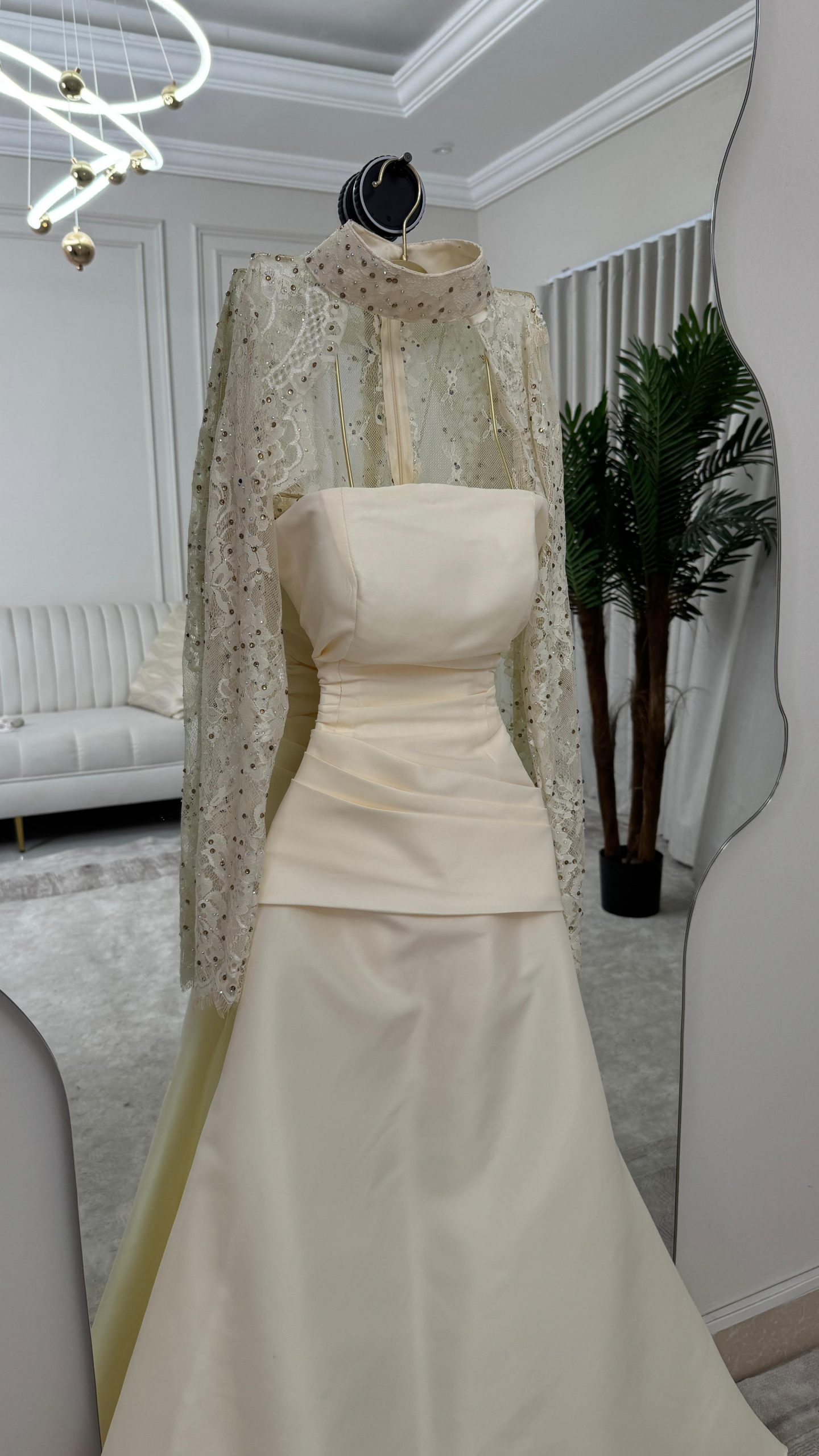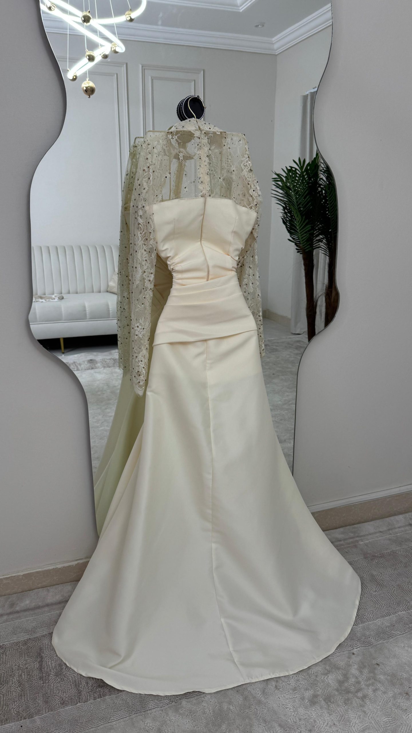 فستان سهرة مع كاب دانتيل مطرز – تصميم ملكي راقٍ للمناسبات
