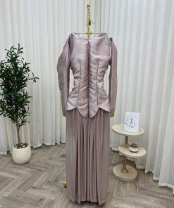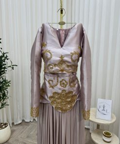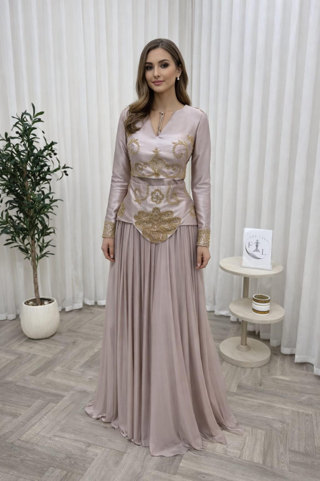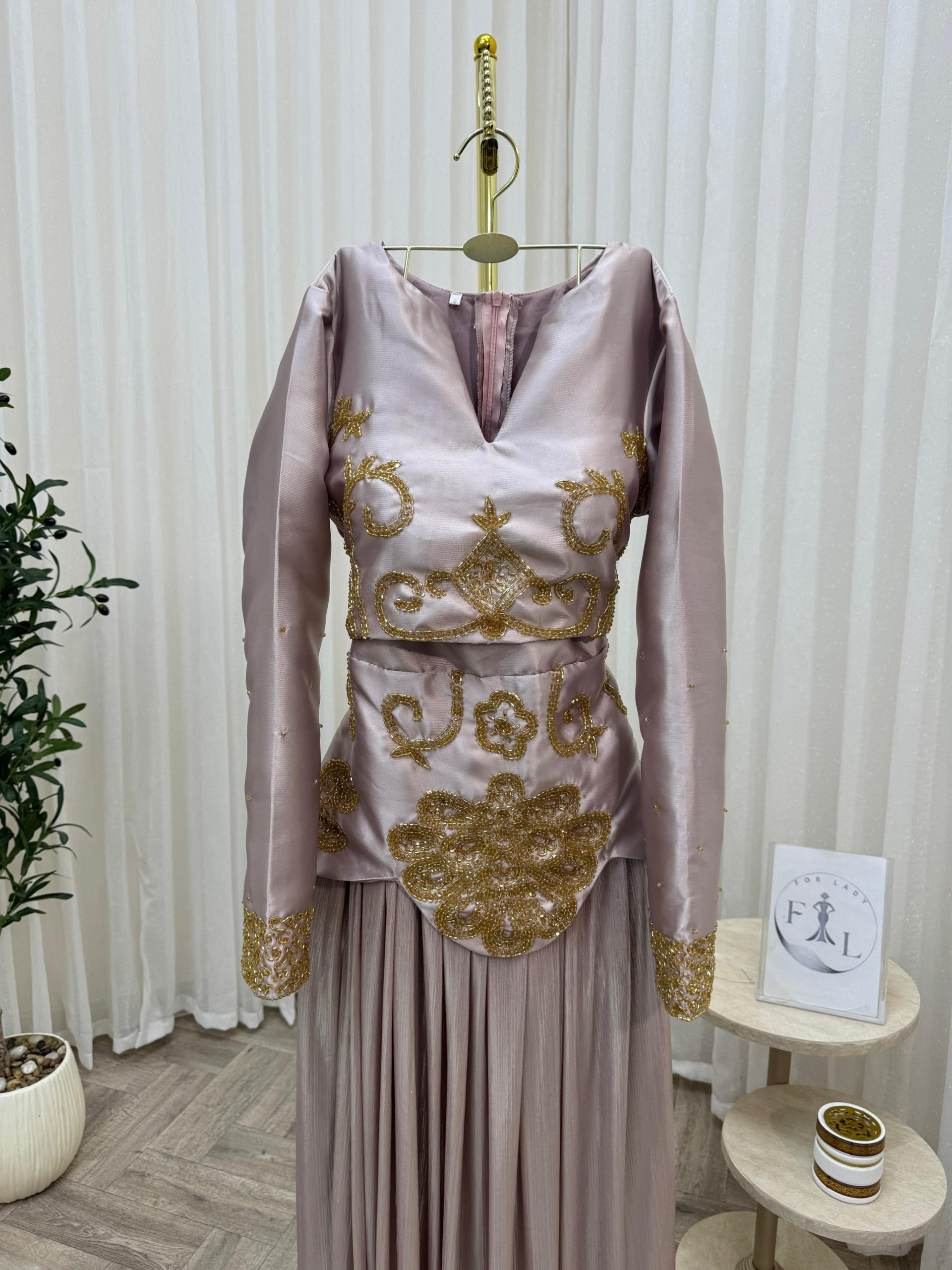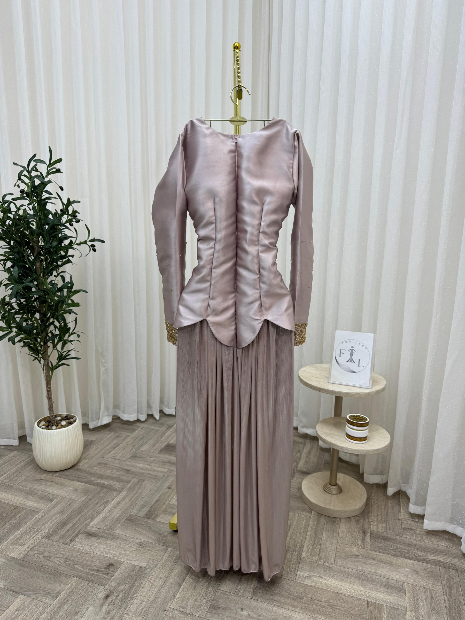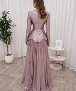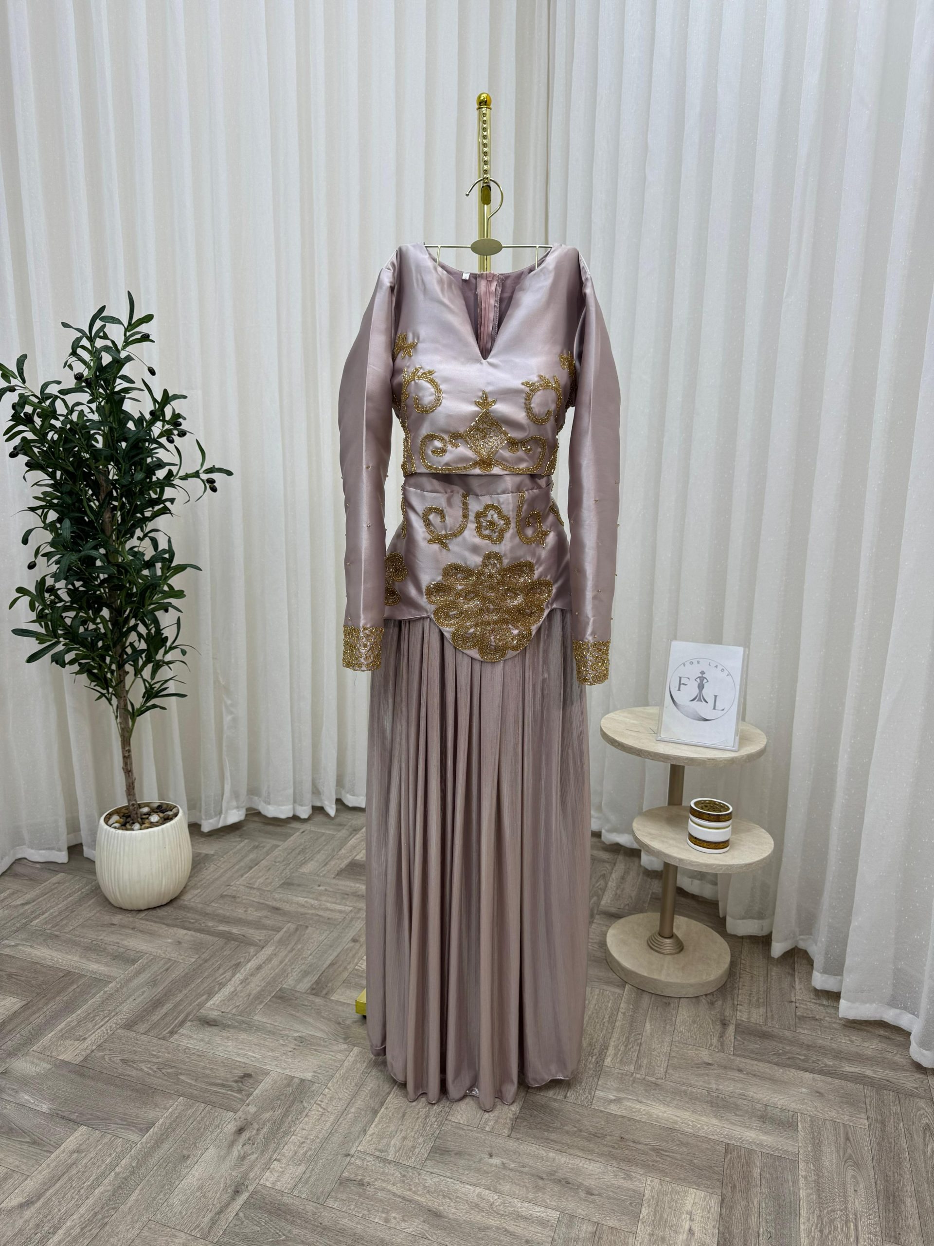 يأتي الفستان بقصة محددة عند الخصر وتنورة طويلة واسعة منسدلة تمنحك مظهرًا أنيقًا وانسيابيًا، مع أكمام طويلة تناسب المناسبات الرسمية والسهرات الراقية. لونه الهادئ وتفاصيله الذهبية يجعلان منه خيارًا مثاليًا للأعراس، الخطوبات، والمناسبات الخاصة.