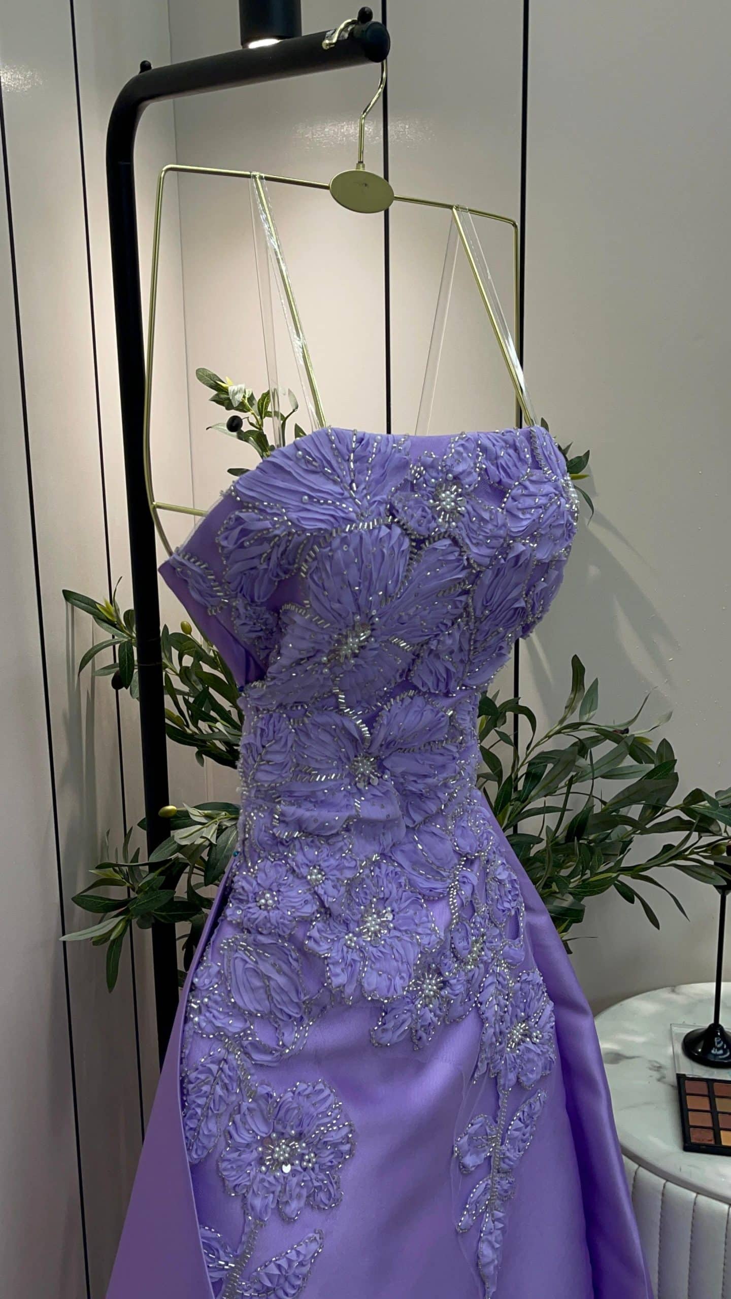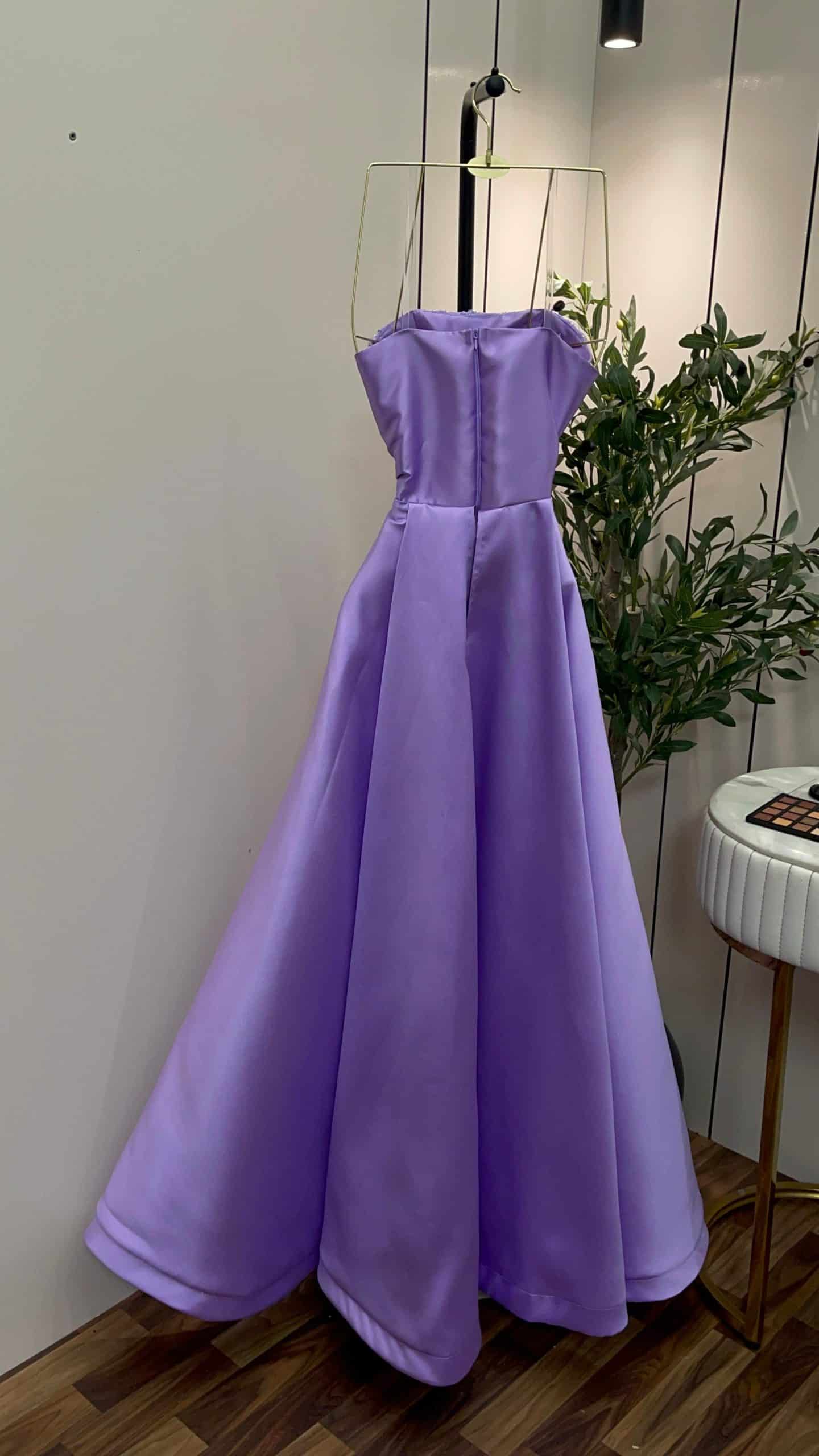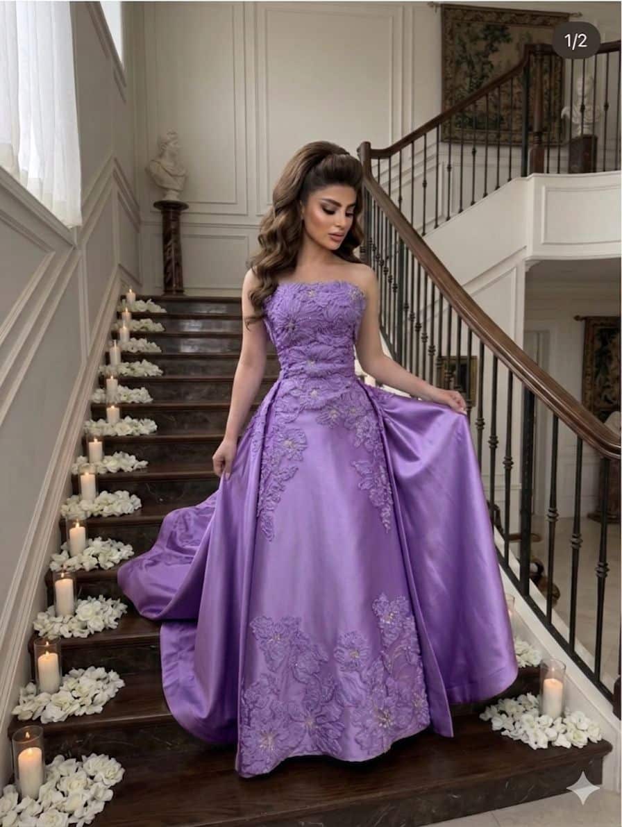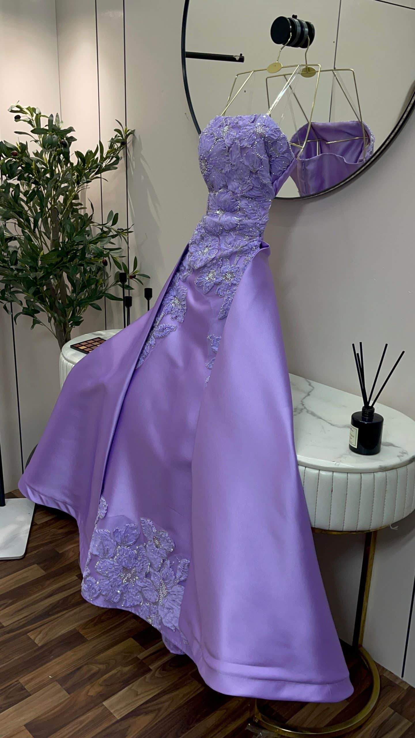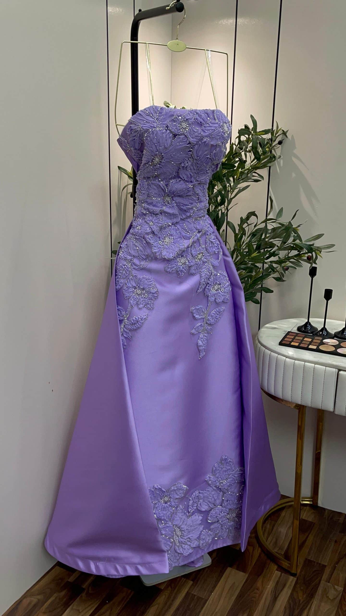 إطلالة ملكية ناعمة مع هذا الفستان البنفسجي الليلكي الفاخر المصمم ليمنحك حضورًا أنثويًا راقيًا. يتميز الفستان بتطريزات ثلاثية الأبعاد على شكل زهور تضيف لمسة فخامة جذابة، مع قصة مستقيمة أنيقة وانسيابية تناسب مختلف القوام.