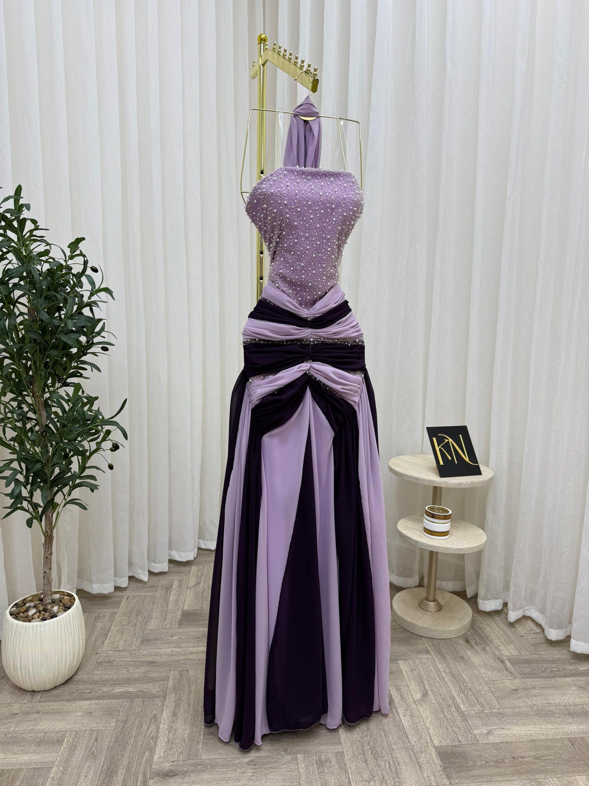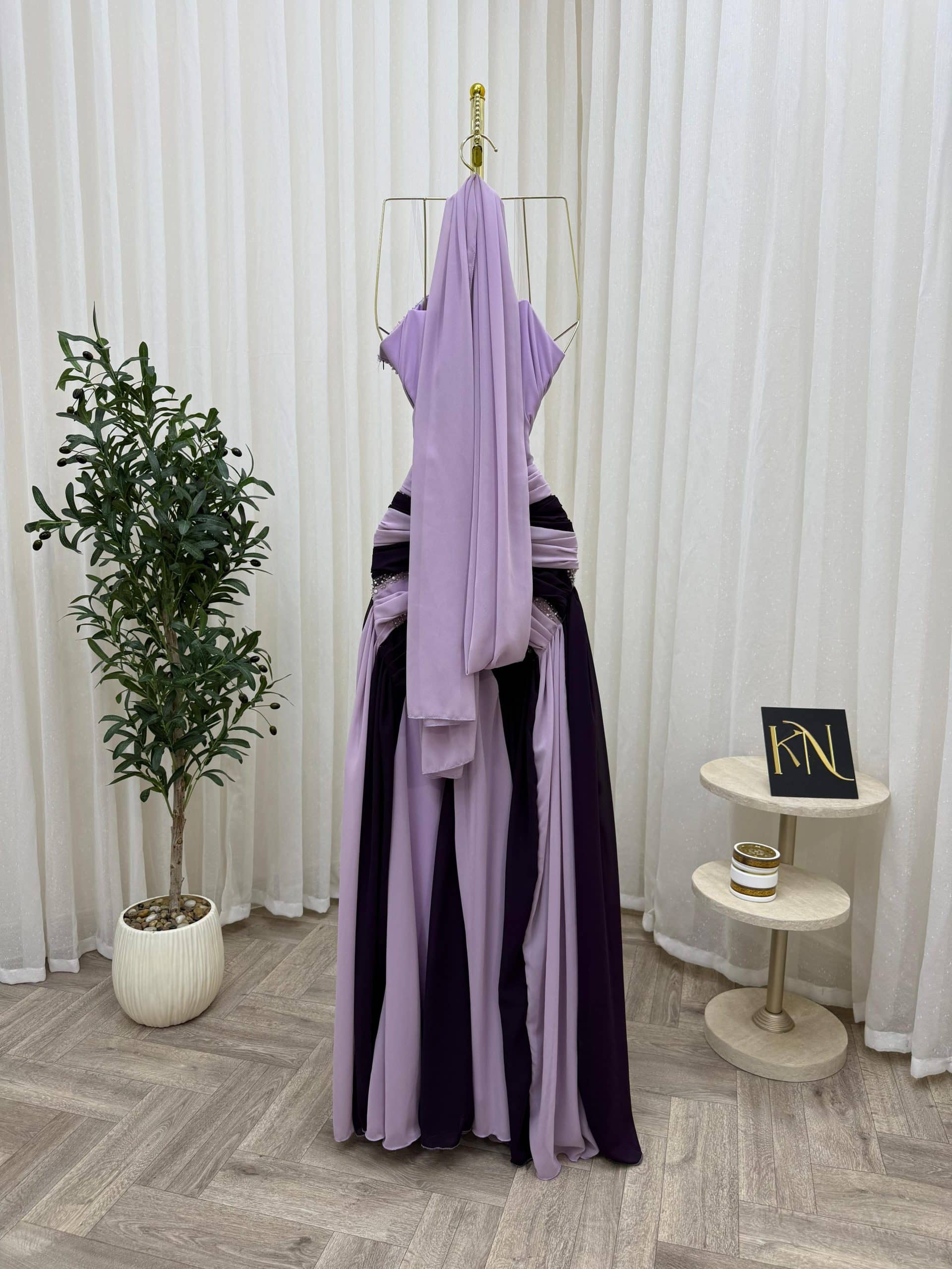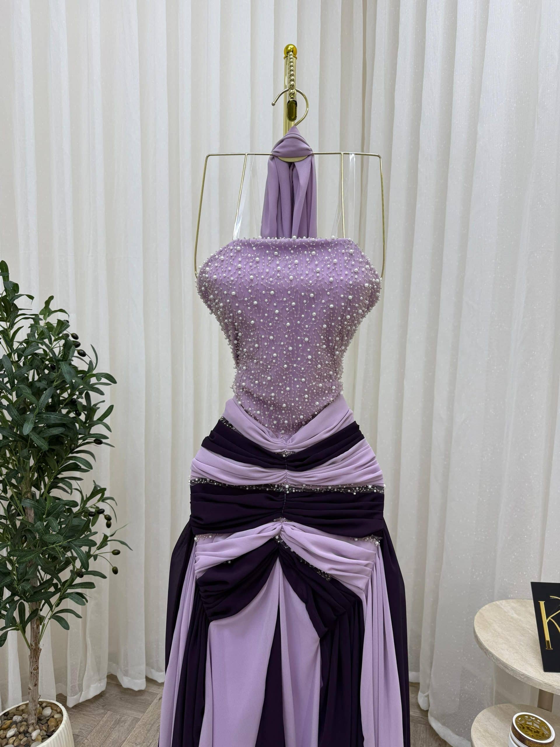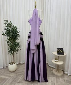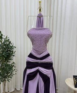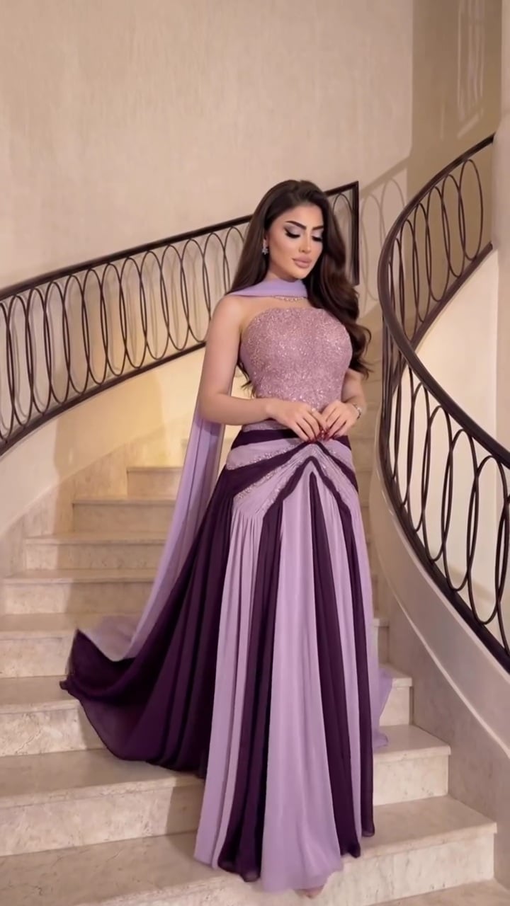 فستان سهرة بتدرجات الموف الفاتح والموف الغامق يمنحك إطلالة أنثوية ناعمة وفاخرة في نفس الوقت، مثالي للمناسبات والحفلات داخل السعودية.