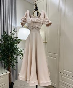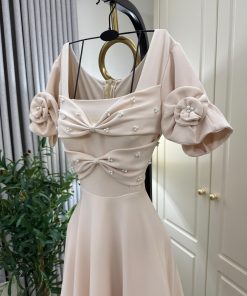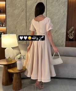 الفستان أنيق ، بتصميم كلاسيكي راقٍ. يتميز بقصة واسعة تنسدل بشكل انسيابي، مع أكمام قصيرة مزينة بوردة بارزة على الكتف. الجزء العلوي مصمم بشكل مربع عند الرقبة، مع تفاصيل كسرات وزينة لؤلؤية تضيف لمسة فاخرة.