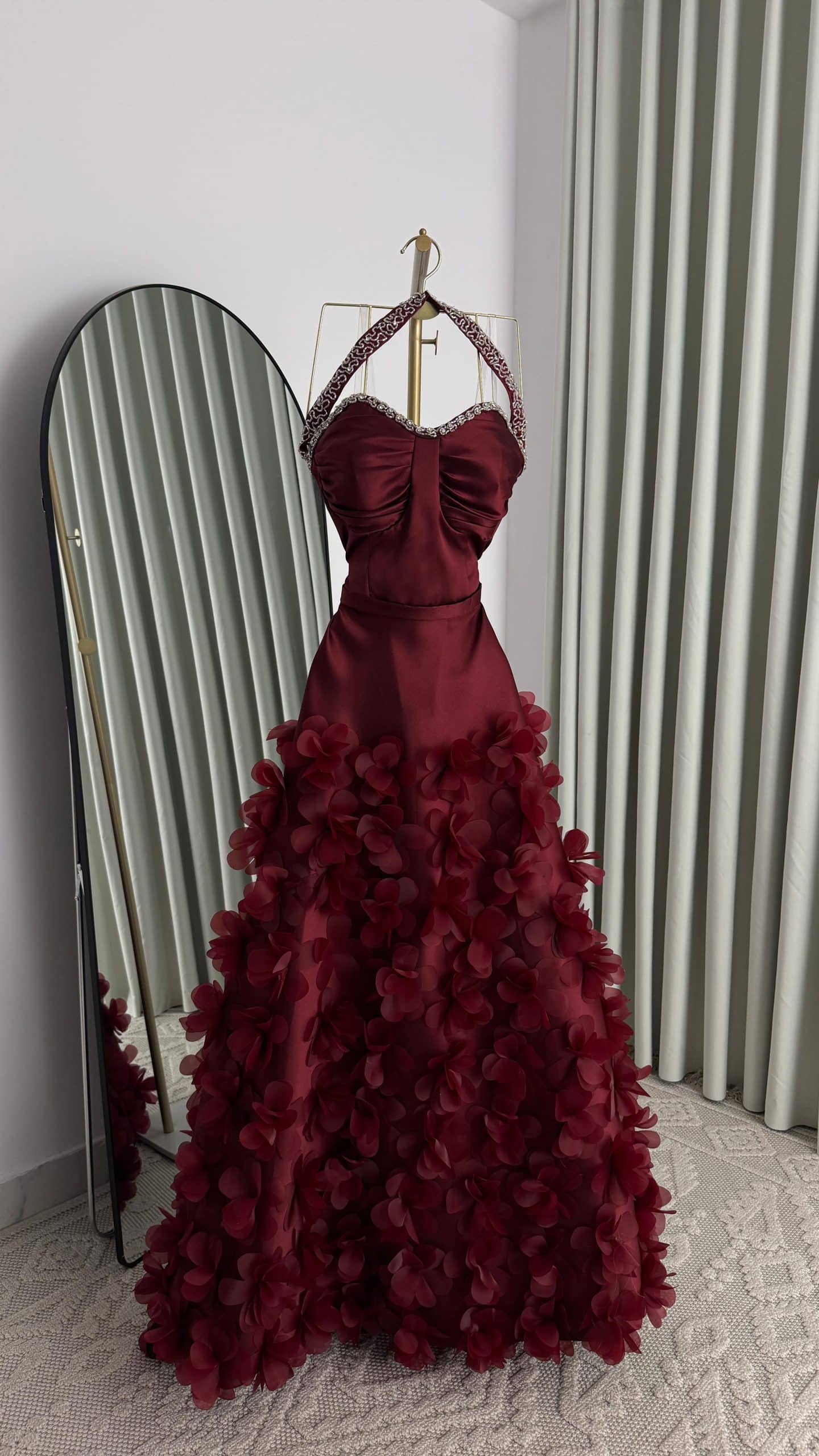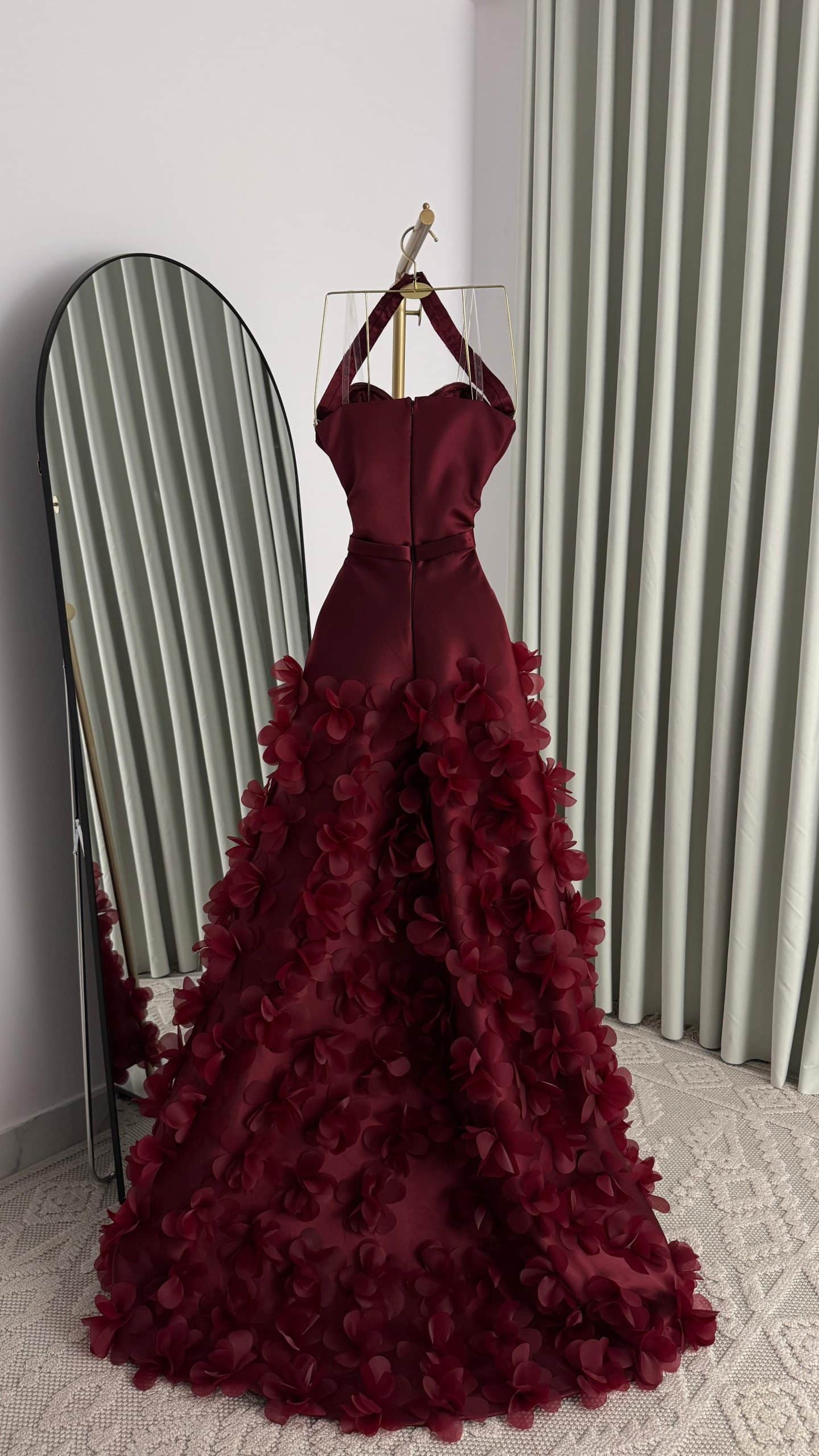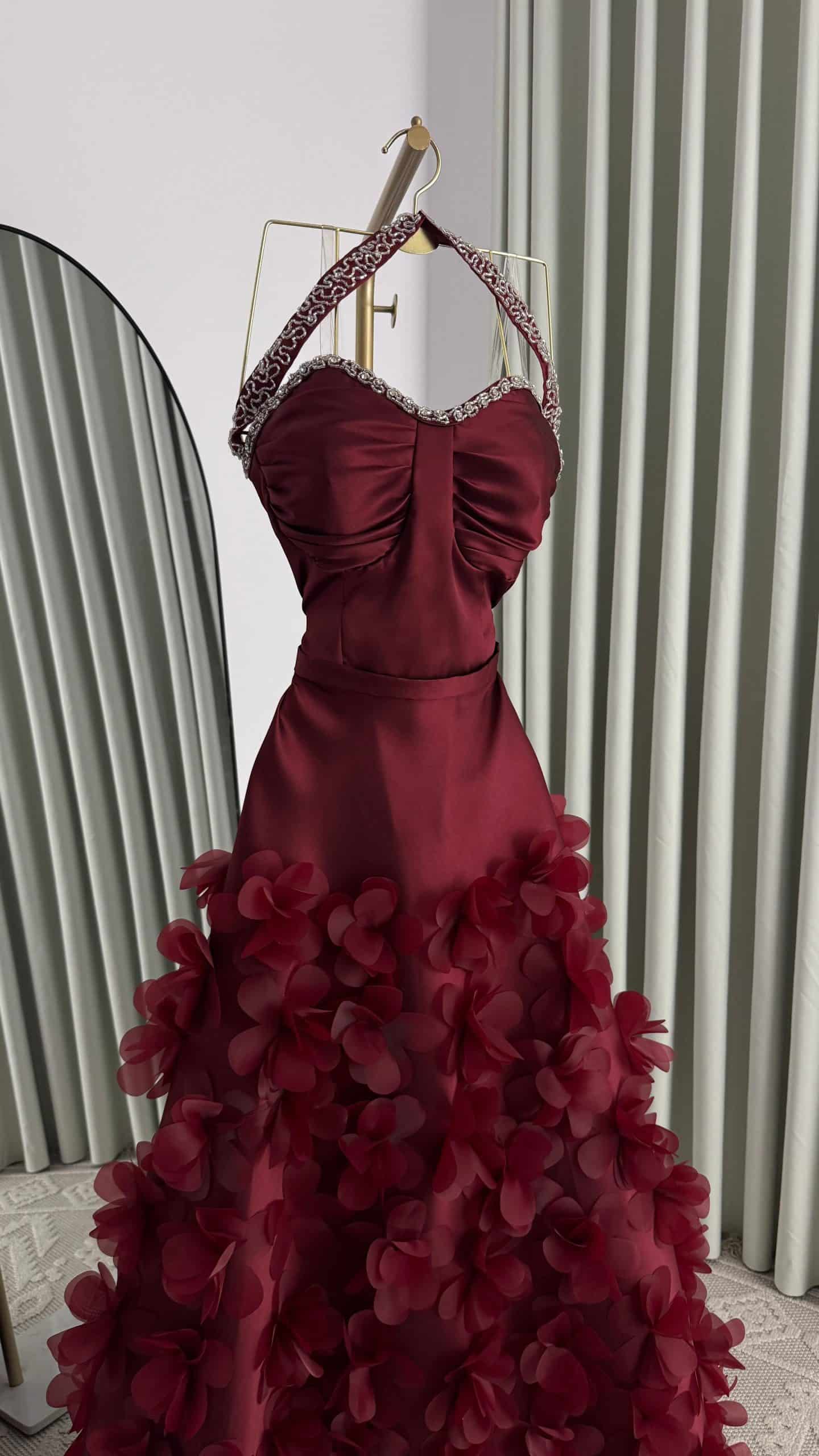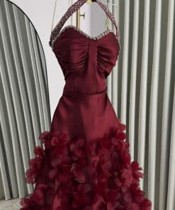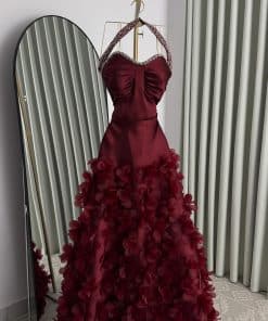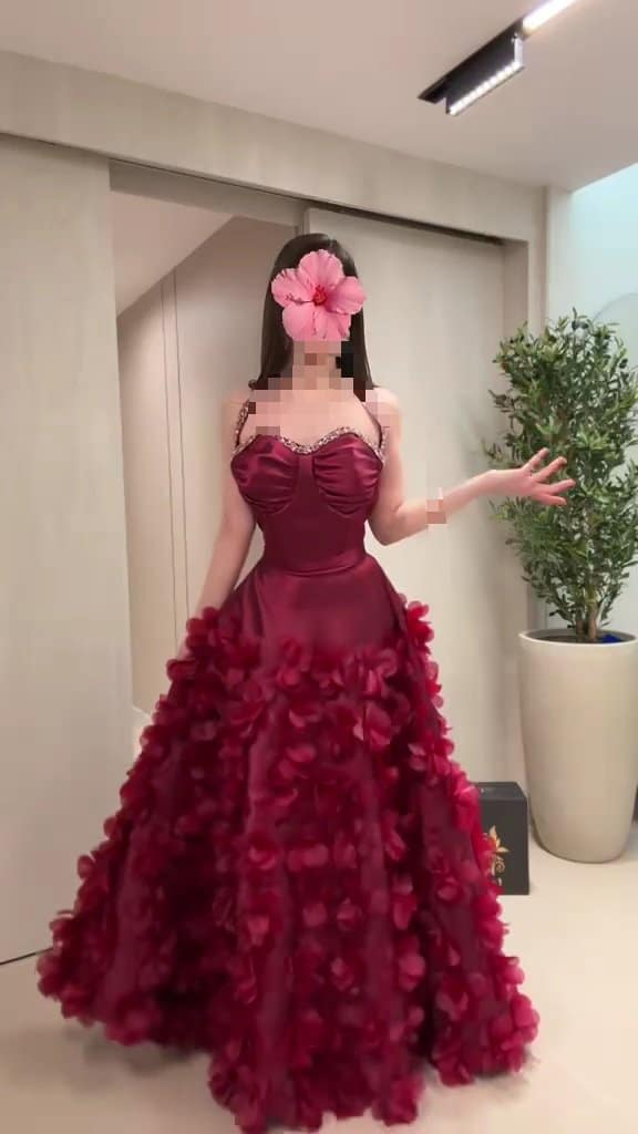 تأتي التنورة بتصميم واسع مزين بورود بارزة ثلاثية الأبعاد، لتمنح الفستان حركة ساحرة وحضورًا ملكيًا يناسب حفلات الزفاف، الخطوبة، والاستقبالات الفخمة في السعودية. اللون النبيتي العميق يضيف إحساسًا بالرقي والجاذبية، ويجعل الإطلالة مناسبة لكل من تبحث عن فستان فخم ومميز يخطف الأنظار.