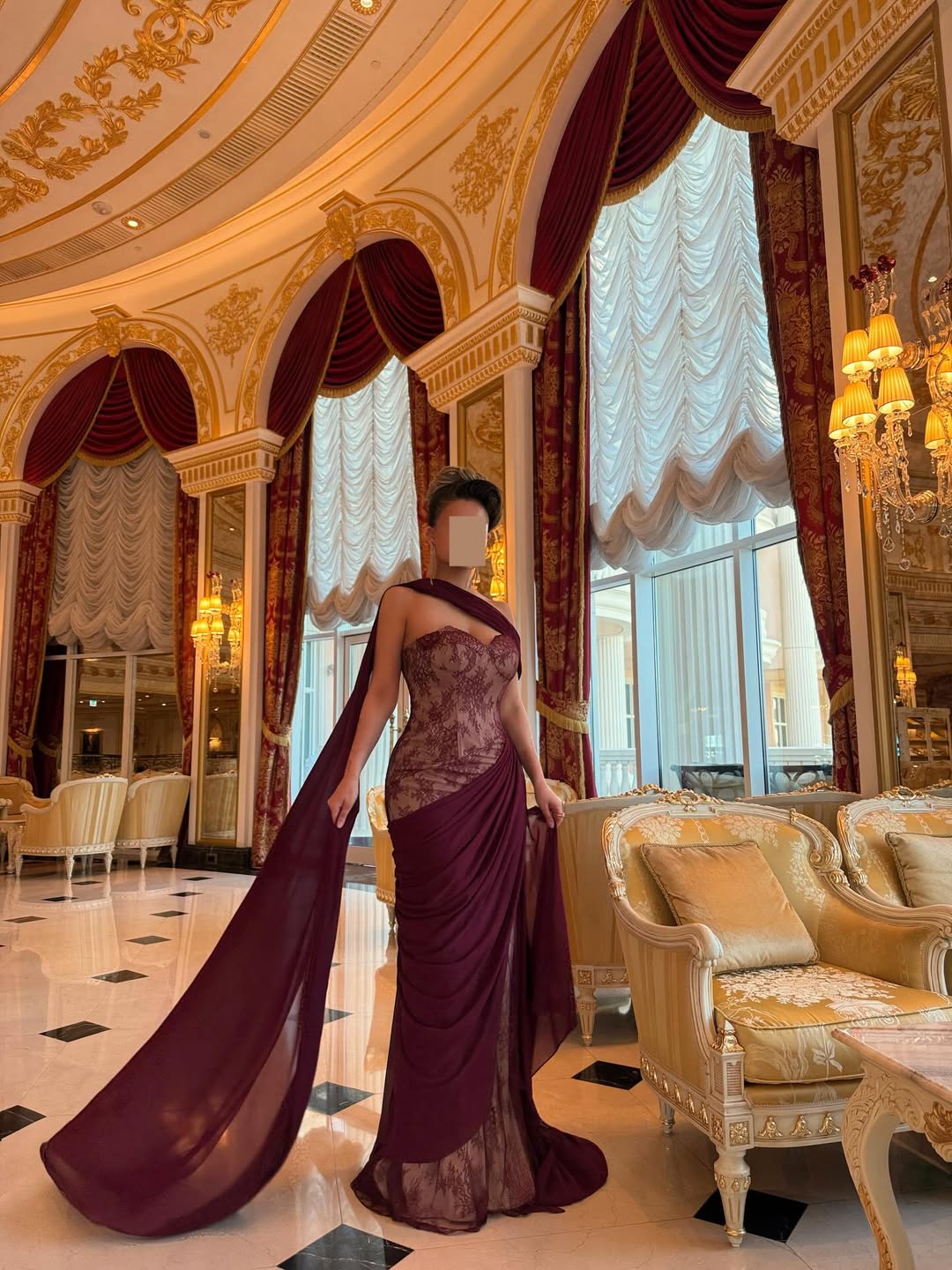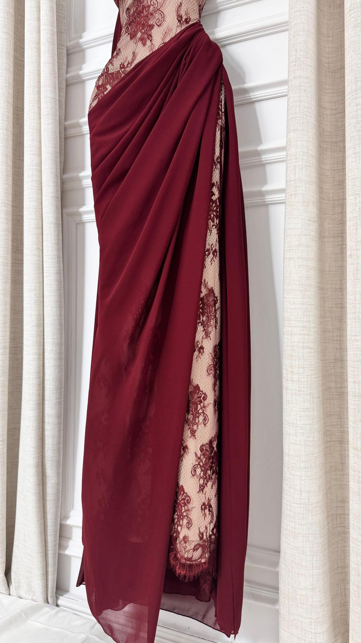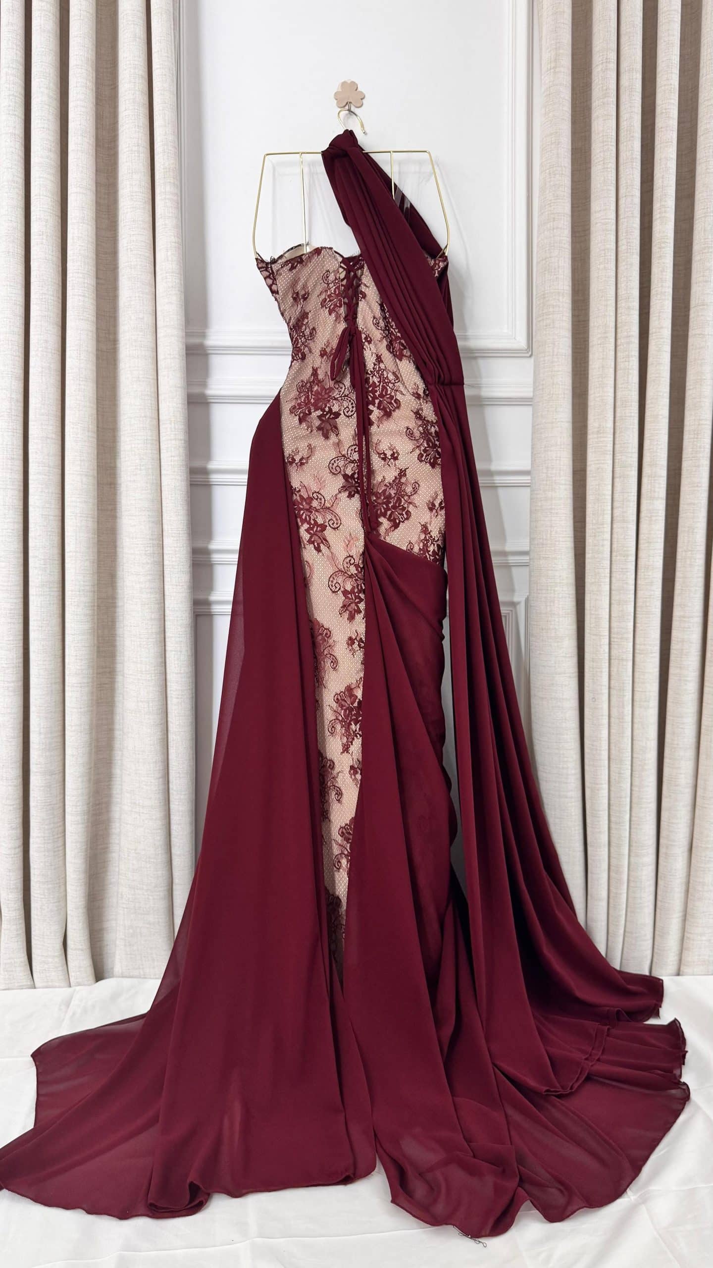 تألقي بإطلالة ملكية مع هذا الفستان النبيتي الفاخر المصمم بتفاصيل دانتيل راقية وقصّة أنيقة تبرز جمال القوام. يتميز بشال طويل يضيف لمسة درامية فخمة وحضور قوي في المناسبات. خيار مثالي لحفلات الزفاف والسهرات الراقية في السعودية، حيث يجمع بين الفخامة والأنوثة بأسلوب جذاب لا يُقاوم.