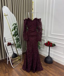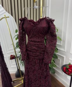 يأتي الفستان بلون نبيتي عميق، يعكس الفخامة والأنوثة في آن واحد. الجزء العلوي مزين بتفاصيل من الدانتيل الناعم، مع أكمام طويلة من الدانتيل تعطي الفستان لمسة من الرقي والأناقة. التنورة التي تنساب بخفة تعزز جمال التصميم، مما يجعل هذا الفستان الخيار المثالي للمناسبات الرسمية والسهرات الخاصة.