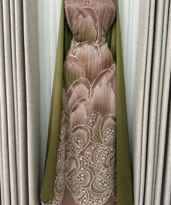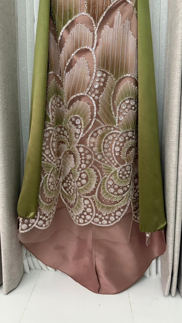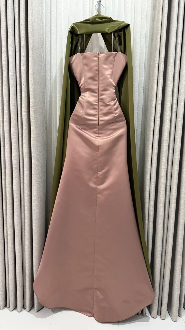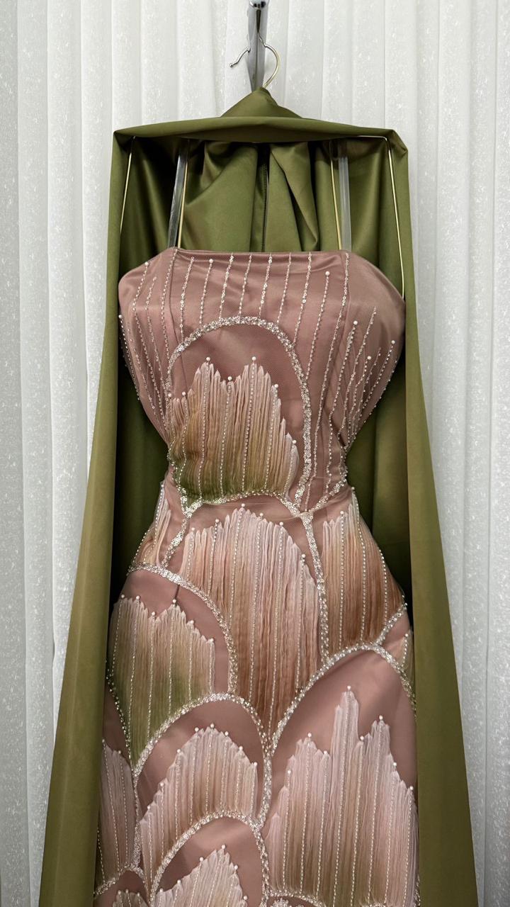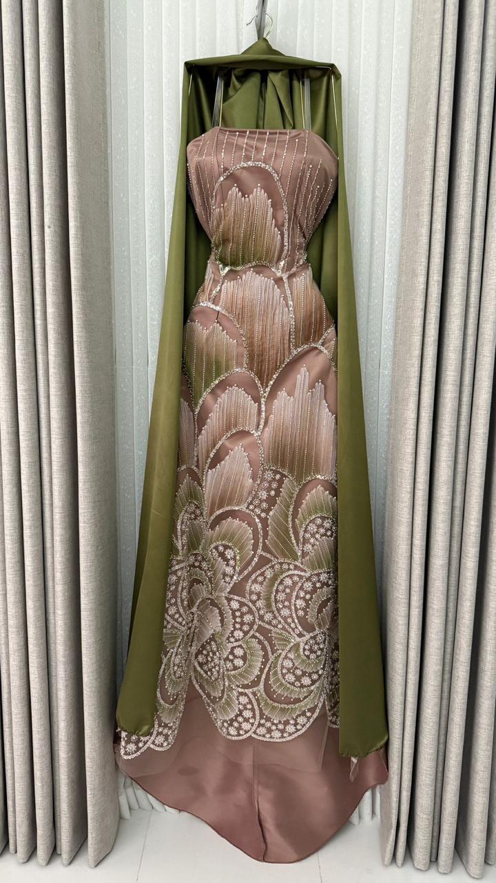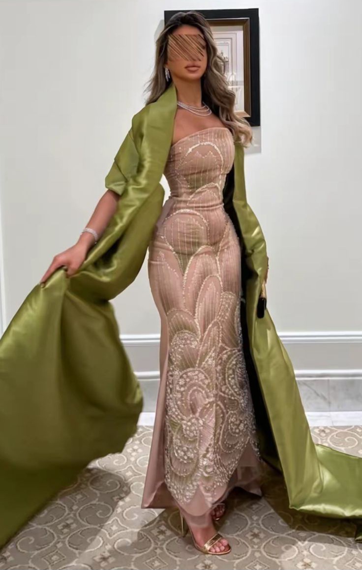 فستان سهرة نود فاخر بتطريز أنيق مع شال زيتي ساتان | متجر روزيتا السعودية
