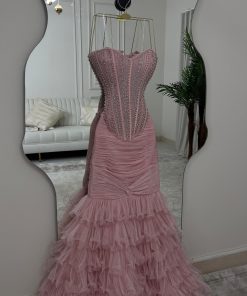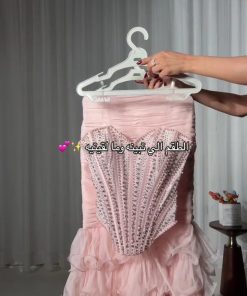 فستان سهرة وردي بتصميم كورسيه وكشكش فاخر