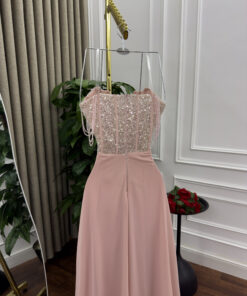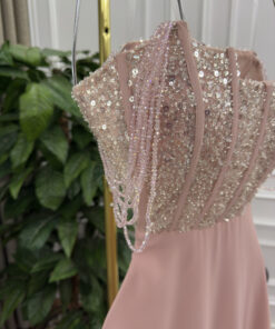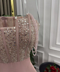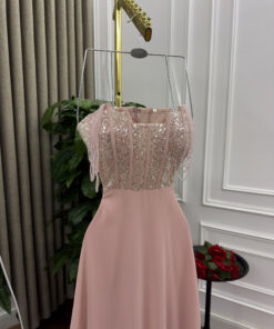 إذا كنتِي تبحثين عن إطلالة أنثوية ناعمة تخطف الأنظار، فهذا الفستان الوردي هو الخيار الأمثل لك. يأتي التصميم بلون وردي خفيف يعكس الرقة والأناقة، مع تطريزات ترتر لامعة على الجزء العلوي تضيف لمسة براقة ساحرة.