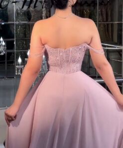 فستان سهرة وردي بتصميم ناعم وبسيط وتطريز ترتر لامع
