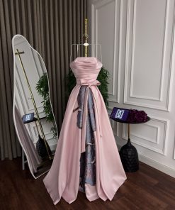 فستان سهرة وردي بقصة سترابلس مع فيونكة أنيقة