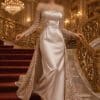 يأتي الفستان مع كاب قصير مطرز يضيف لمسة ملكية عصرية، مما يجعله خياراً مثالياً لـ فساتين سهره فخمه، فساتين مناسبات، فساتين خطوبة، وفساتين حفلات في السعودية.