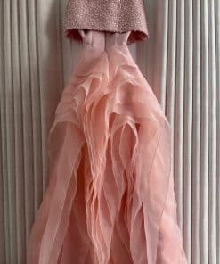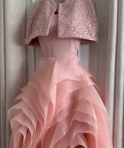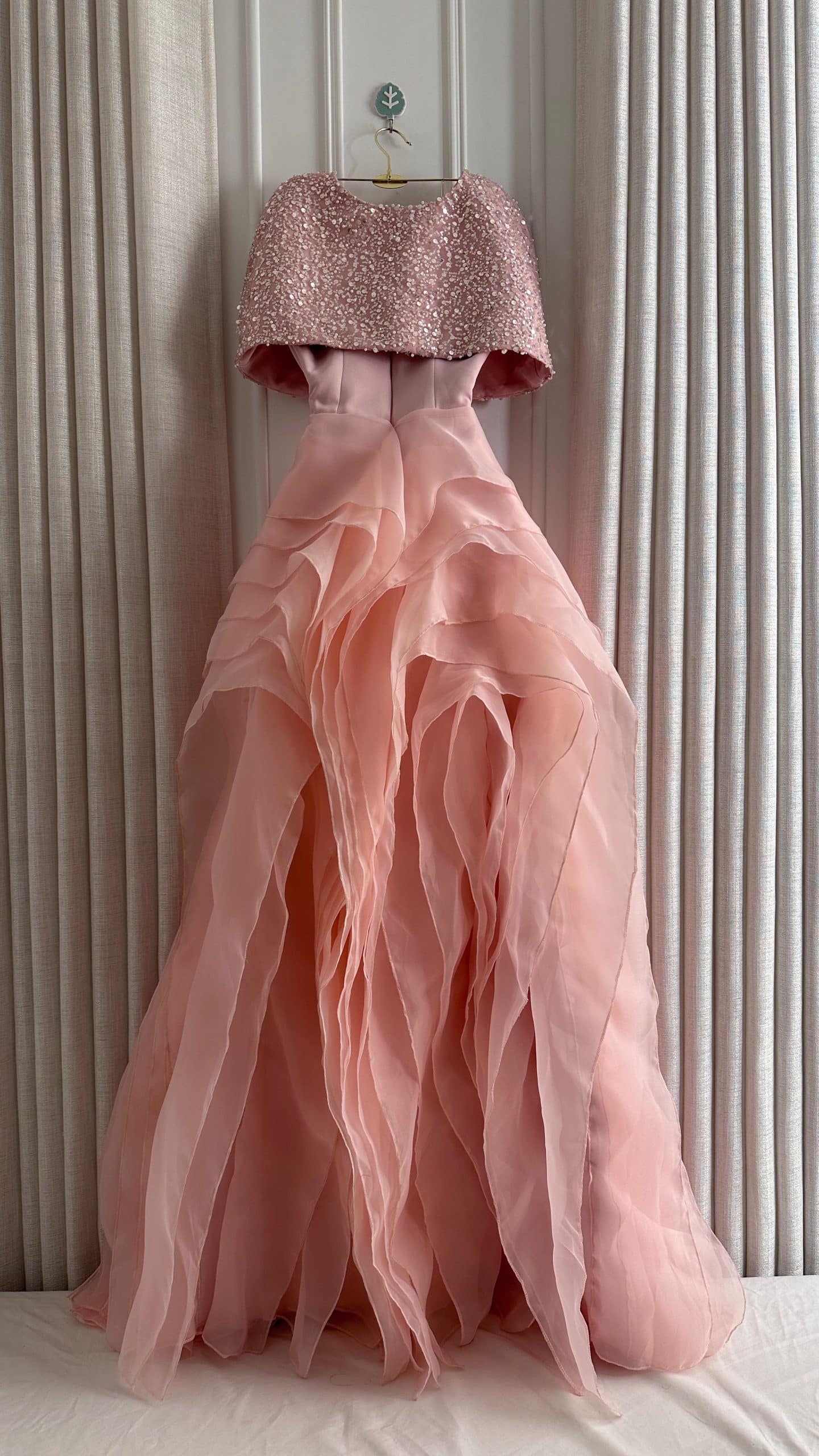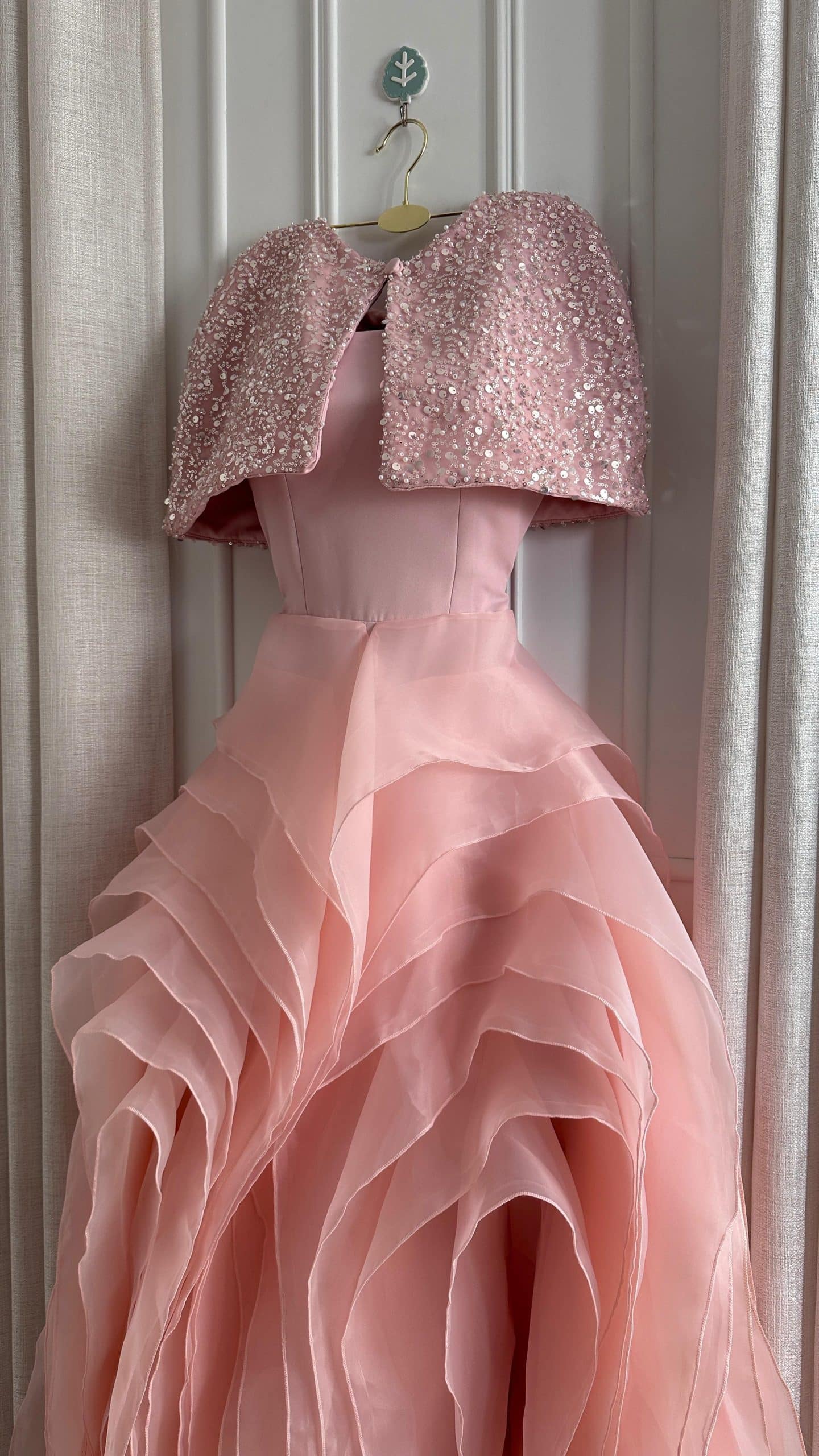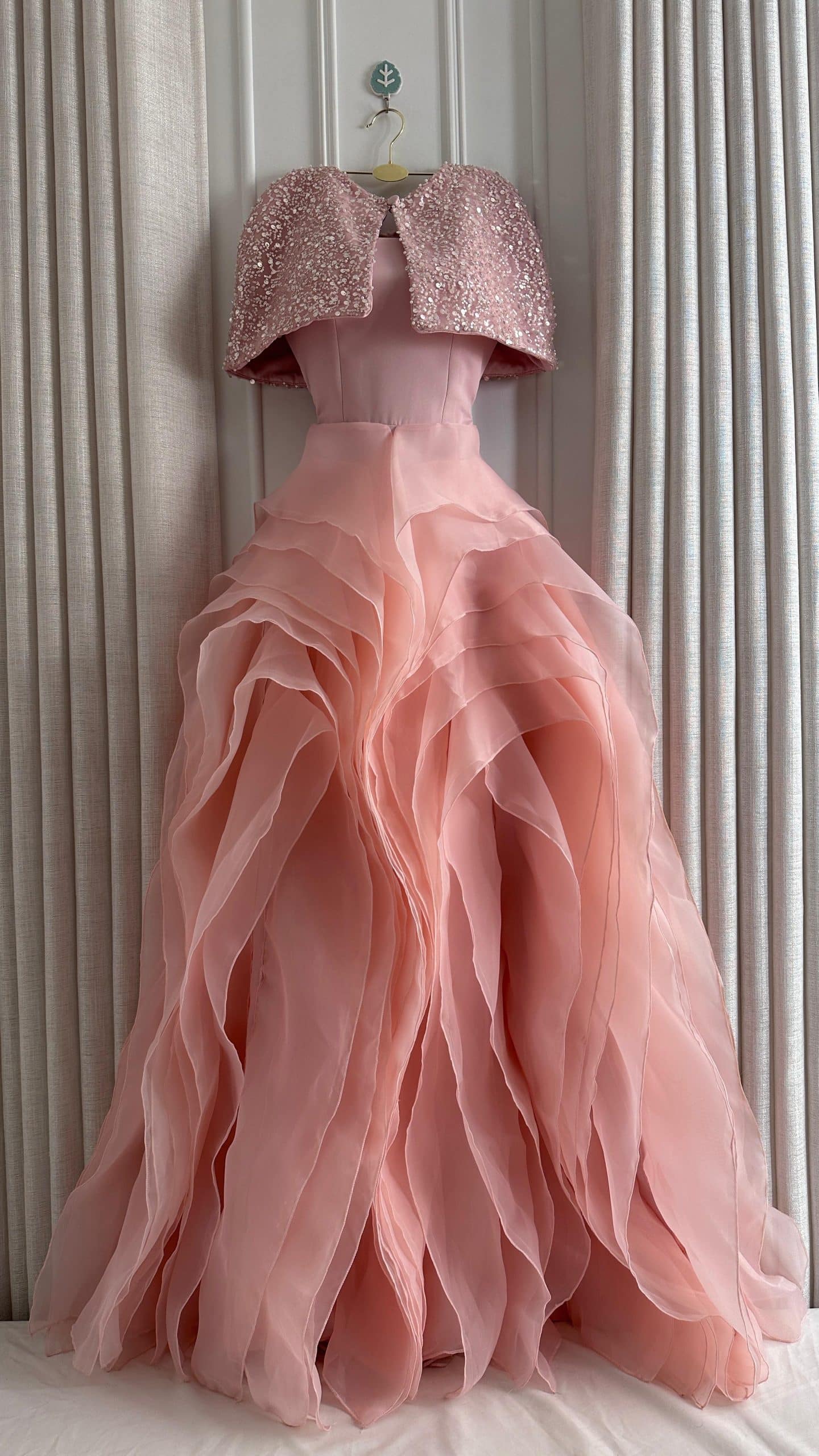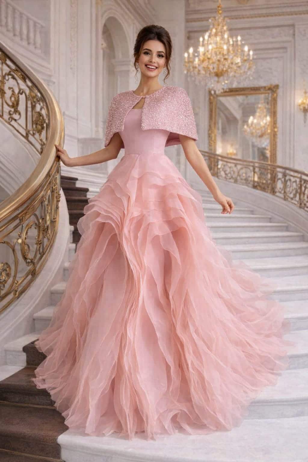 فستان سهرة وردي فاخر يجمع بين الأناقة والرقي، مثالي للنساء في السعودية الباحثات عن إطلالة مميزة في الحفلات والمناسبات الخاصة. تصميم أنثوي راقٍ بطبقات تول ناعمة تمنحك مظهراً فخماً وحركة انسيابية جذابة.
