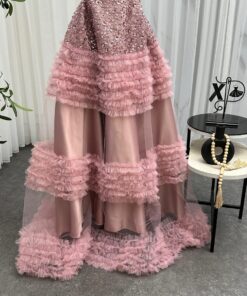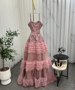 استمتعي بإطلالة تخطف الأنظار مع فستان سهرة وردي فاخر يتميز بتصميم أنثوي راقٍ ومطرزات فخمة على الجزء العلوي. الفستان مزود بحمالات رفيعة وقصة ضيقة من الأعلى تبرز جمال القوام، بينما تنسدل التنورة الواسعة بطبقات تول ناعمة تمنحك حضورًا ملكيًا في أي مناسبة. مثالي لحفلات الزفاف، الخطوبة، والسهرات الفاخرة.