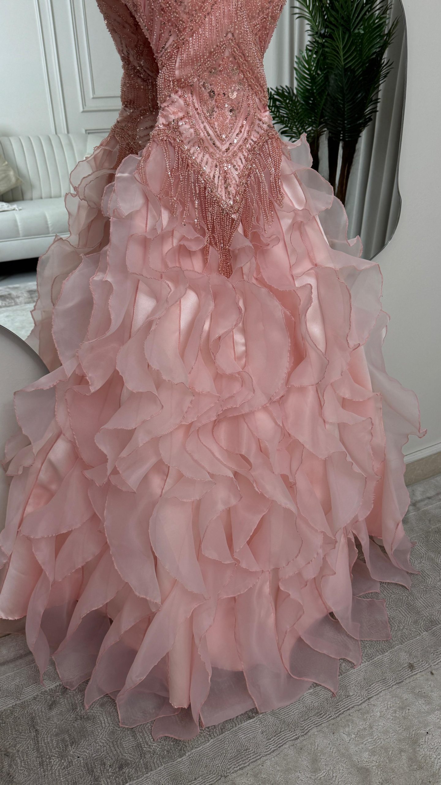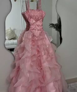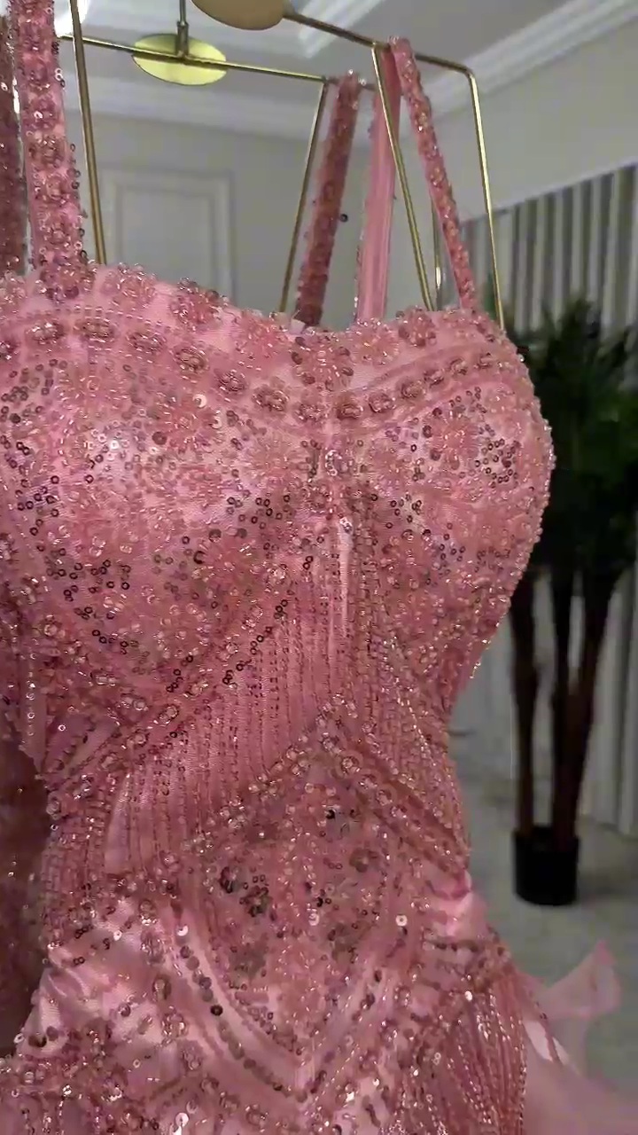 فستان سهرة وردي منفوش فاخر بتطريز لامع | متجر روزيتا السعودية