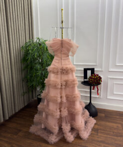 فستان سهرة وردي فاتح بطبقات من الكشاكش – إطلالة ملكية من متجر سعودي
