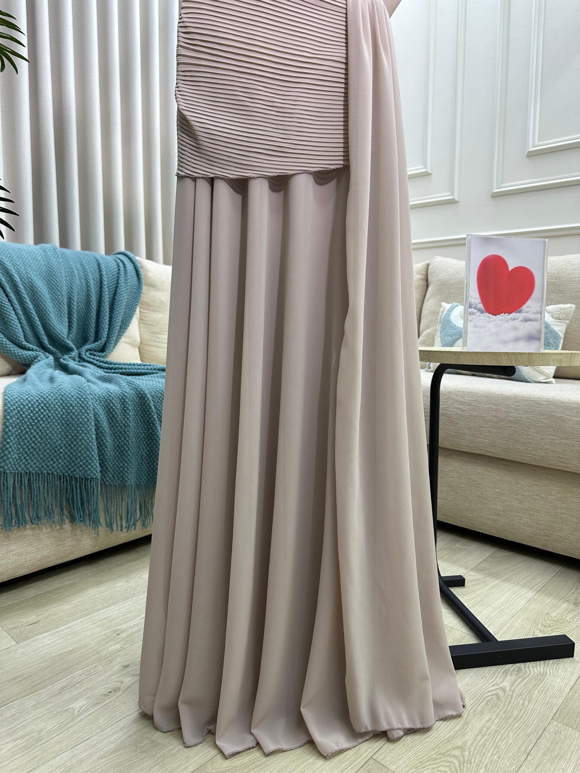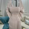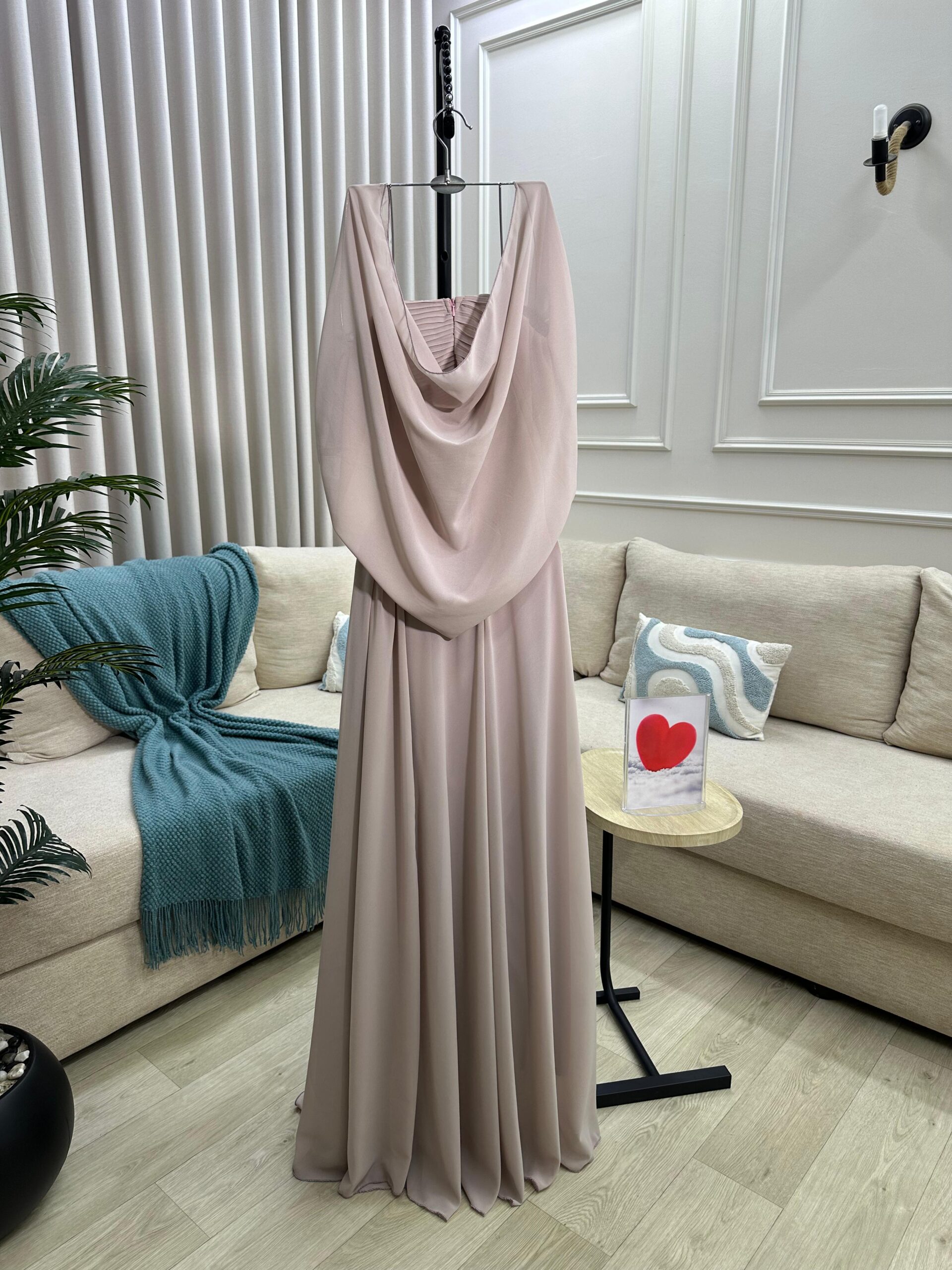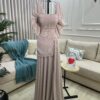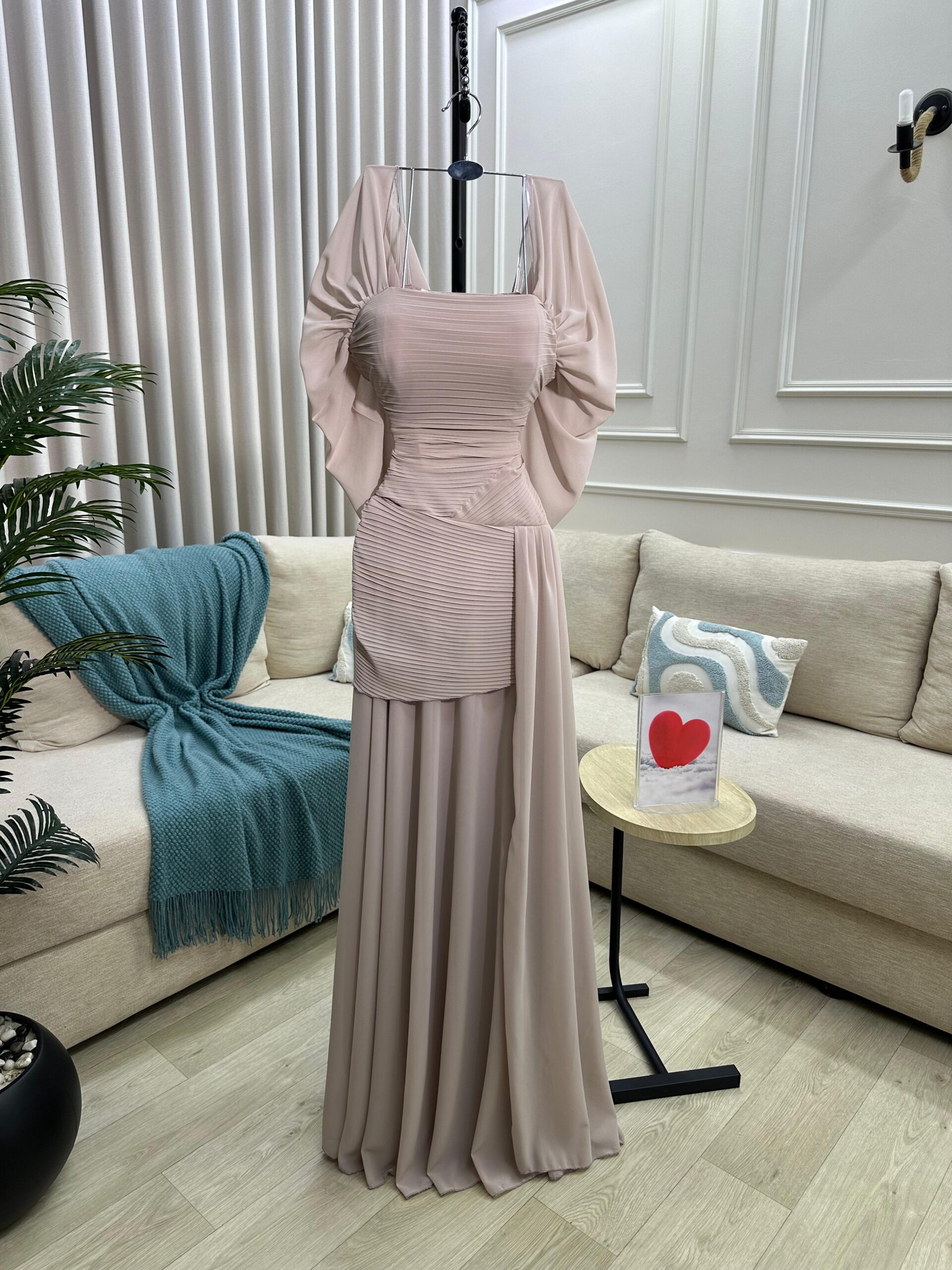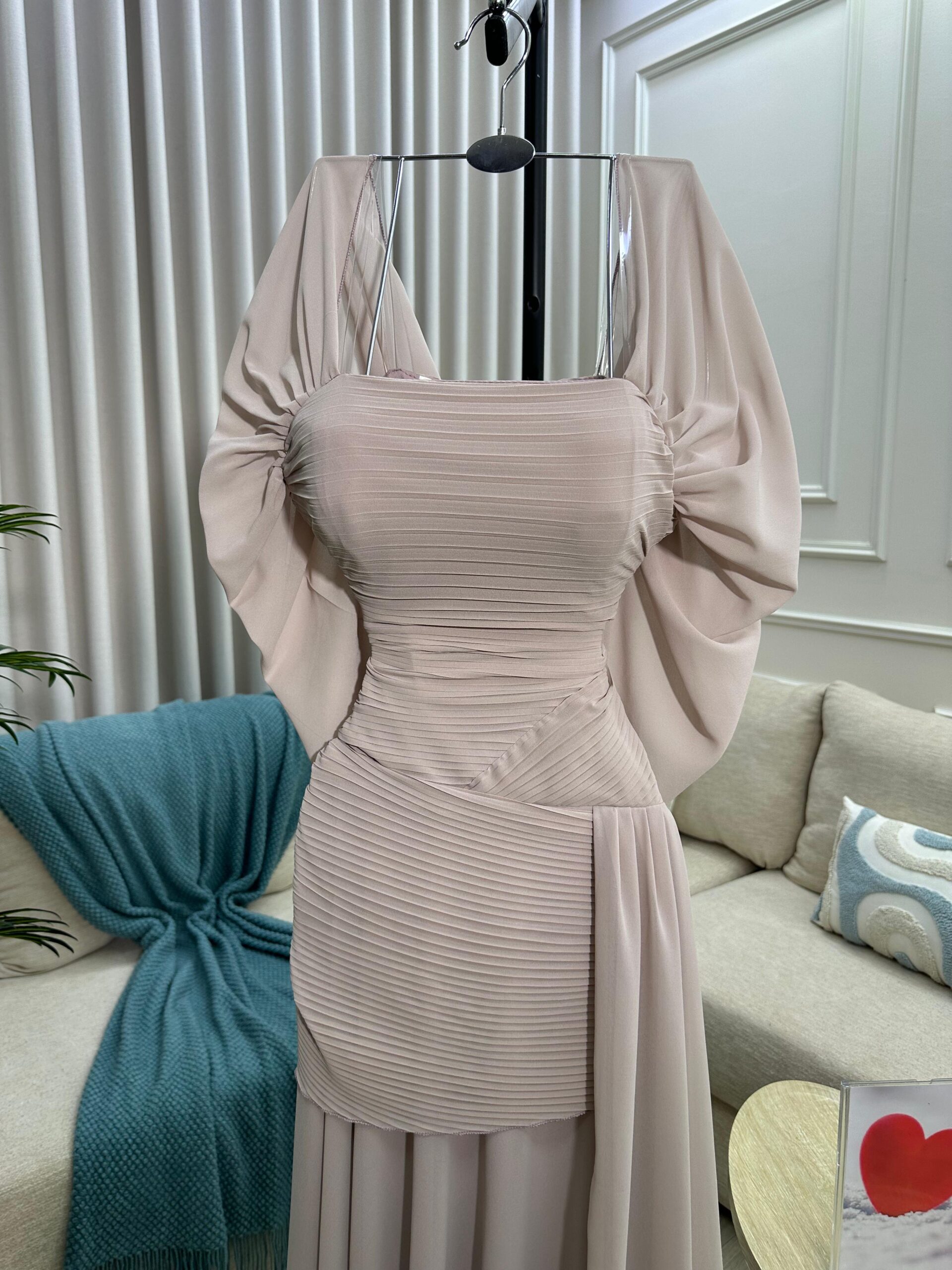 فستان سهرة وردي فاتح بتصميم عصري وأكمام منسدلة – متجر سعودي