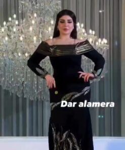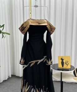 تألقي في أرقى المناسبات مع هذا العامل الأسود المصمم الملكي بقصة أنثوية جذابة. تتميز بملابس طويلة الأكمام وأكشاك ناي باشرت مشاهدتها، مع تصميم فاخر على الأكتاف الذهبي دايركت لتوصل من الفخامة. تزين تطريزات براقة بأوراق الكريستال الذهبي والضي على الجزء السفلي، ما يجعل خياراً مثالياً للمناسبات الرسمية، والسهرات، وحفلات الزفاف.