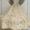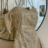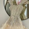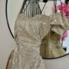 يأتي الفستان بلون ذهبي لامع يُكمل جماله الفريد بتطريزات فضية مذهلة، مصممة بدقة عالية لتحاكي الإضاءة بأروع شكل. القماش يتناغم بسلاسة مع منحنيات الجسد ليضفي لمسة من الرقي والجمال.