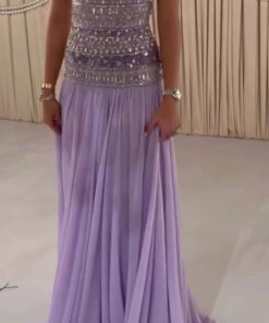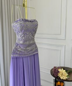 فستات يجمع بين النعومة والرقي، يتألق هذا الاختلاف البنفسجي الفاتح (اللافندر) ليكون عنواناً للأناقة الهادئة والرفاهية الناعمة. توممم بخط رفيع “سترابلس” يكشف الأكتاف ويمنح الإطلالة لمسة أنثوية جذابة، في حين يتزين الجزء العلوي منه بتطريزات متقنة من الخرز والكريستال، تتألأ بانعكاسات كاملة ومليئة رونقاً خاصاً.
