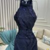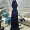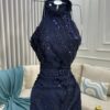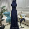 فستان سهرة بلون كحلي داكن، يتميز بتصميم أنيق بدون أكمام مع ياقة مرتفعة (هالتر) تضفي لمسة من الرقي والفخامة.
