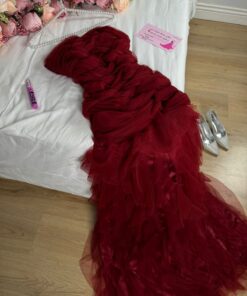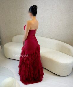 يتميز بتصميم فاخر ومناسب للمناسبات الخاصة. الفستان بدون أكمام، ومصمم بقصة ضيقة من الأعلى تتسع في الأسفل مع طبقات من الكشكش تضيف لمسة من الأناقة والأنوثة. التصميم الكلاسيكي يجعله مثالياً للسهرات والحفلات. الإكسسوارات المستخدمة، مثل العقد، تضيف لمسة من البريق إلى المظهر العام.