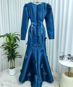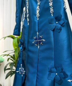 فستان سهرة أزرق بترولي بتطريز فضي فاخر وتصميم ملوكي – من روزيتا