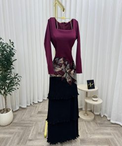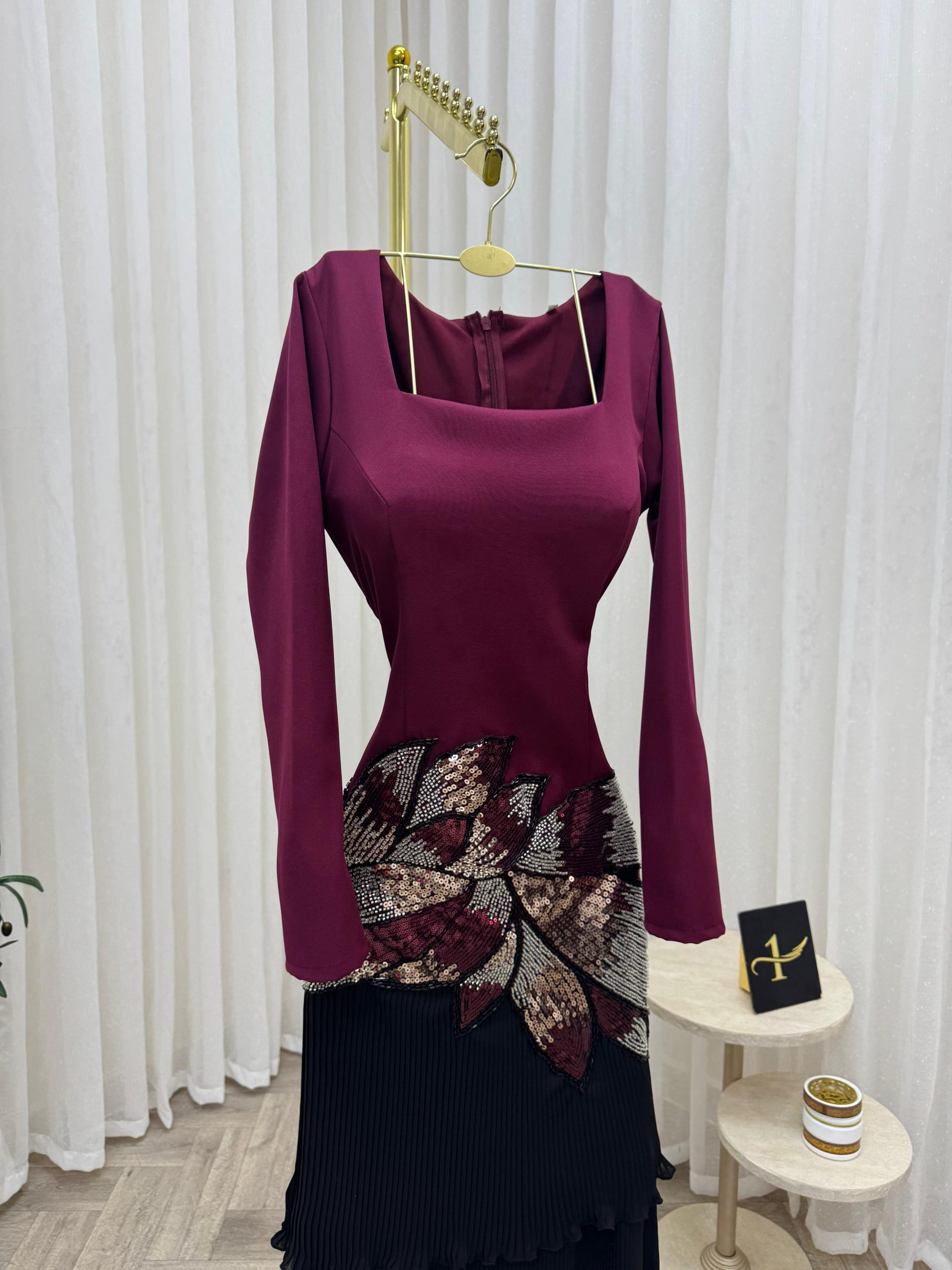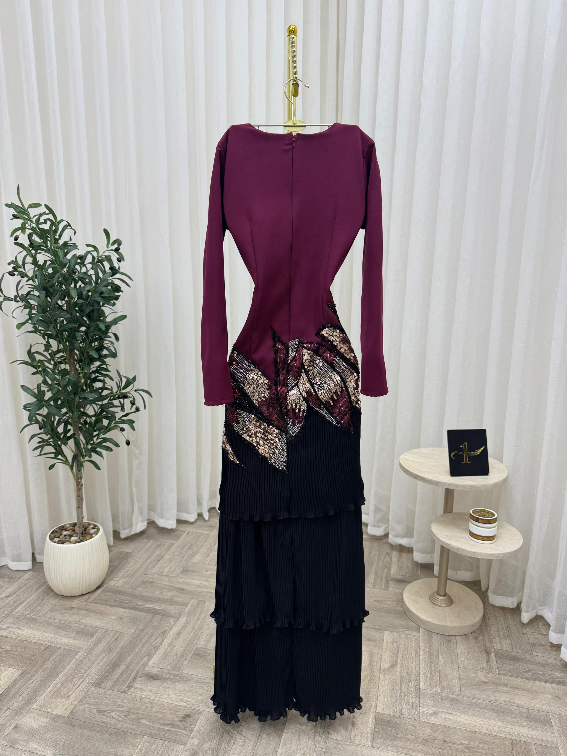 يتميز الفستان بجزء علوي بلون عنابي أنيق بأكمام طويلة يمنحك مظهرًا راقيًا ومحتشمًا، مع تنورة سوداء متعددة الطبقات تضيف حركة وانسيابية جذابة أثناء المشي. تتزين منطقة الخصر بتفاصيل لامعة بنقوش فاخرة تمنح الفستان طابعًا مميزًا ولمسة فخامة ملفتة.
