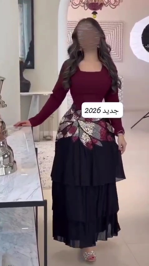 تألقي بإطلالة راقية تجمع بين الفخامة والاحتشام مع فستان مناسبات عنابي وأسود بطبقات أنيقة من متجر روزيتا السعودية، تصميم جديد 2026 يناسب مختلف المناسبات الراقية.