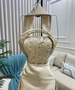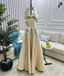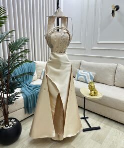 تألقي بإطلالة فريدة مع فستان سهرة بلون الشامبين الحريري، بتصميم عصري ولمسة ملكية بتفاصيل براقة وفتحة أمامية أنثوية. مثالي للحفلات والمناسبات الراقية