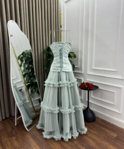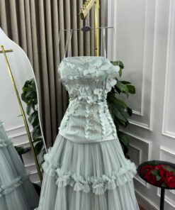 أبهري الجميع بإطلالة أنثوية حالمة مع هذا الفستان الأخضر الباستيل الفخم بتصميم مطرز بالزهور الراقية وطبقات من التول الناعم التي تضيف لمسة ملكية وانسيابية ساحر