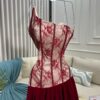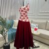 يتميز الفستان بتفاصيل دقيقة على الجزء العلوي المصنوع من الدانتيل الذهبي الذي يعكس الجمال والأنوثة، بينما تنساب التنورة المصنوعة من القماش الجوخ الأحمر لتضفي مظهرًا غنيًا وأنيقًا. مع تفاصيله المدروسة، يضمن لكِ هذا الفستان إطلالة ساحرة في أي مناسبة تختارينها.
