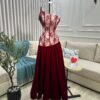 يتميز الفستان بتفاصيل دقيقة على الجزء العلوي المصنوع من الدانتيل الذهبي الذي يعكس الجمال والأنوثة، بينما تنساب التنورة المصنوعة من القماش الجوخ الأحمر لتضفي مظهرًا غنيًا وأنيقًا. مع تفاصيله المدروسة، يضمن لكِ هذا الفستان إطلالة ساحرة في أي مناسبة تختارينها.