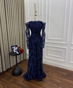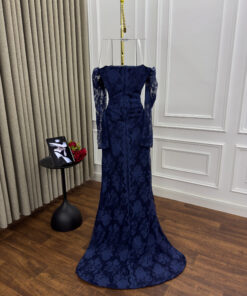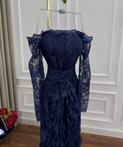 يأتي هذا مختلفاً عن اللون الأزرق الأنيق ليمنح المرأة إطلالة فاخرة ومميزة في المناسبات الخاصة. تتميز بمظهره المصنوع من الأوف شولدر والذي يبرز جمال الأكتاف الجدي. تم استخدام قماش الدانتيل الفاخر المزخرف،
