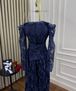 فستان نسائي بارز من الدانتيل الأزرق اللامع وإطلالة أنثوي فاخرة